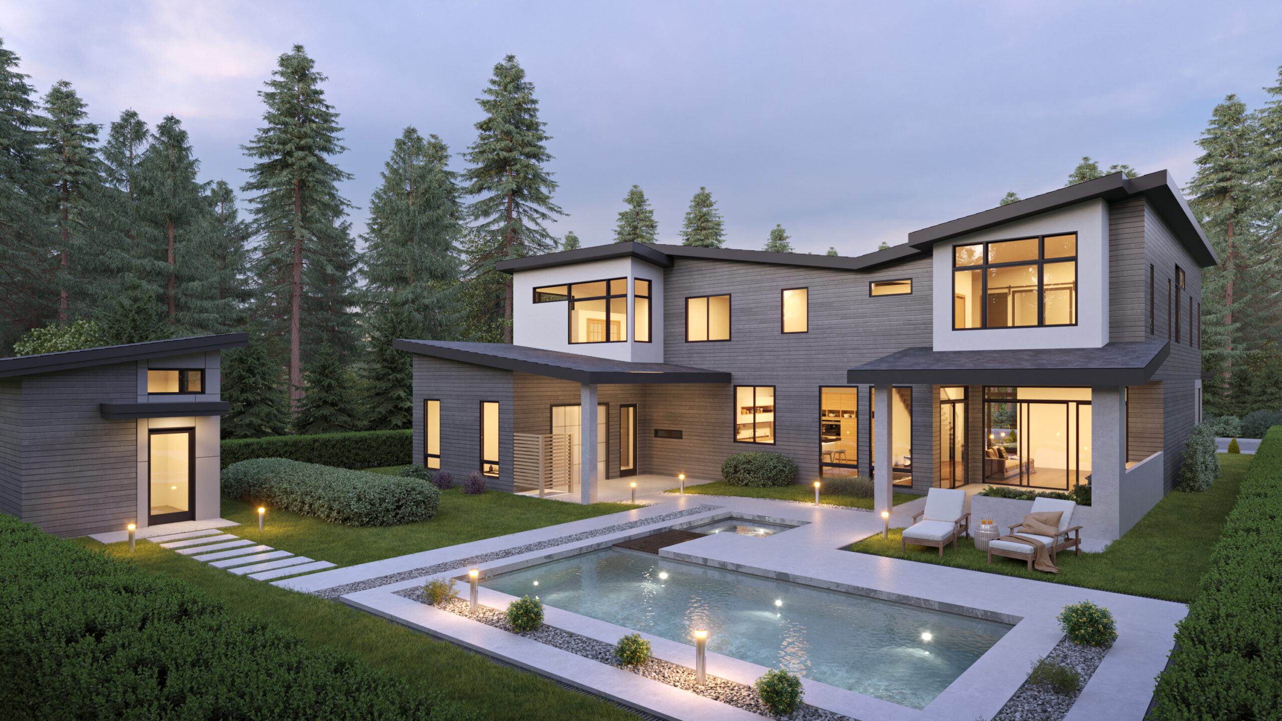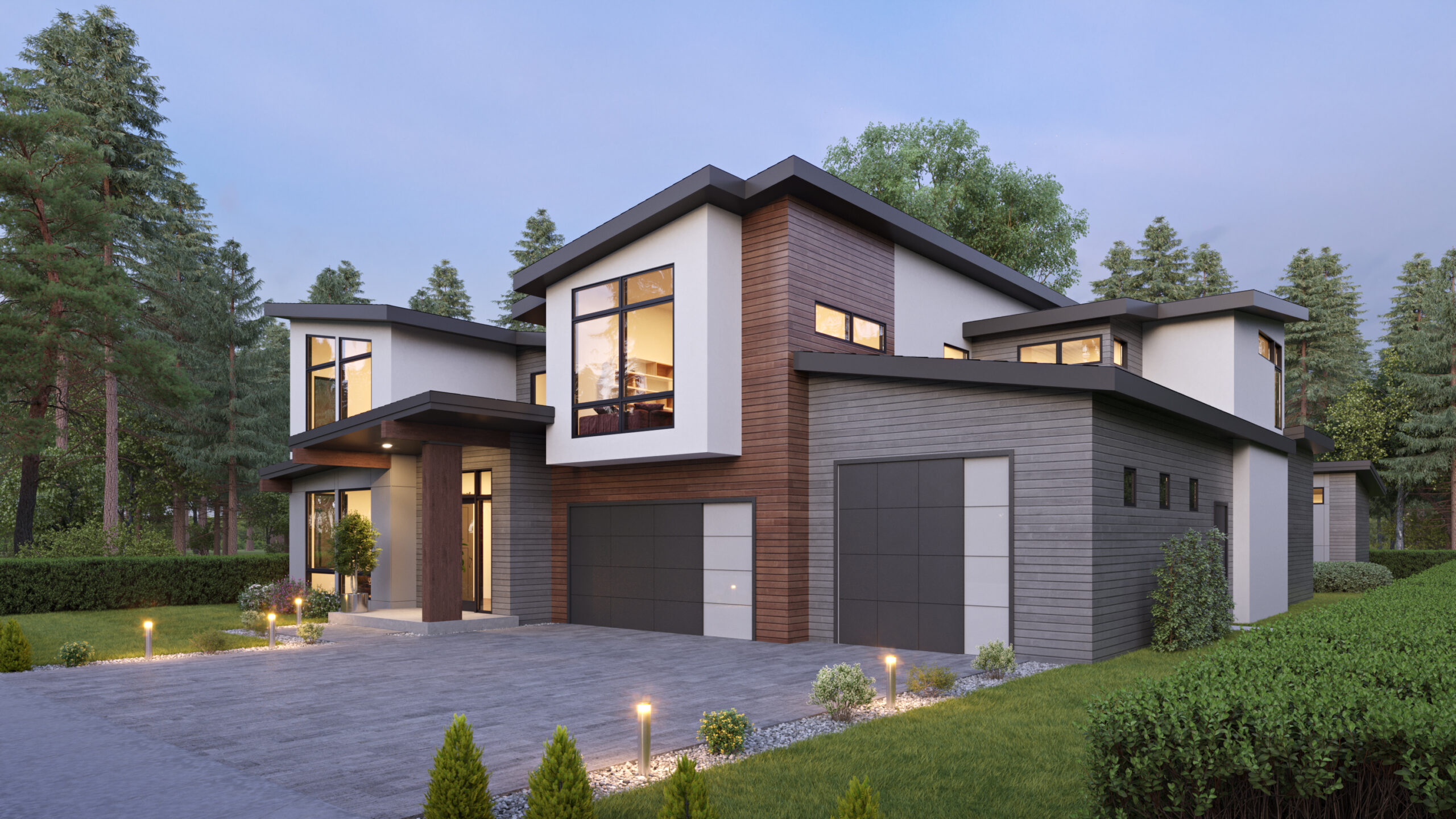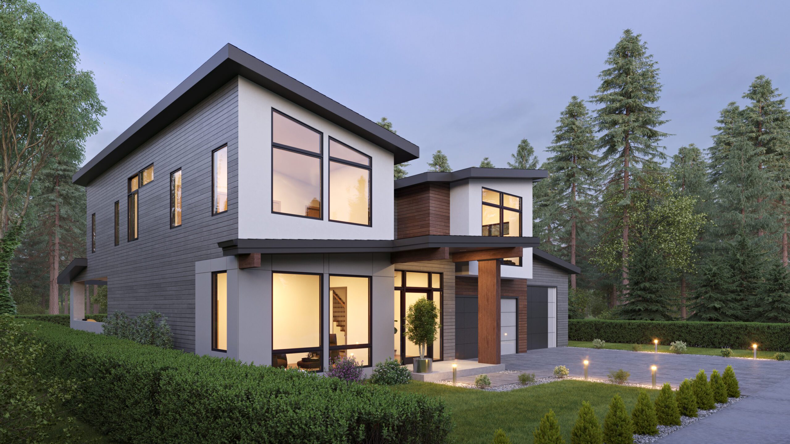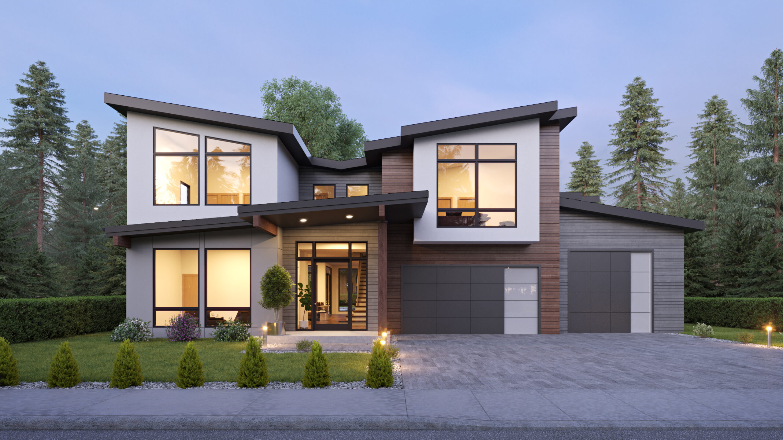 - This modern 5-bed house plan has vertical siding, a standing seam metal roof and a covered entry protecting you as you enter the pair of front doors with transom above.