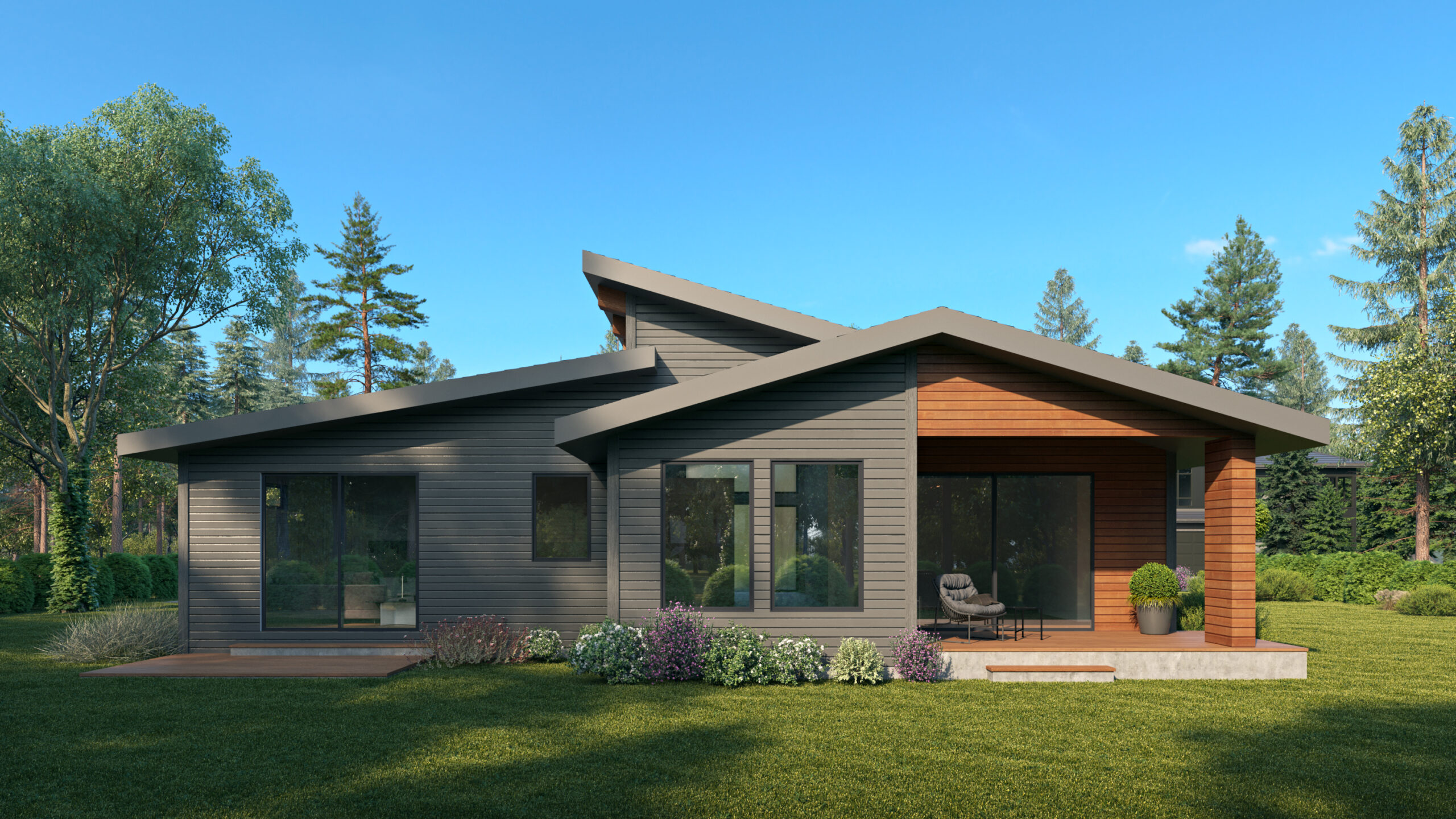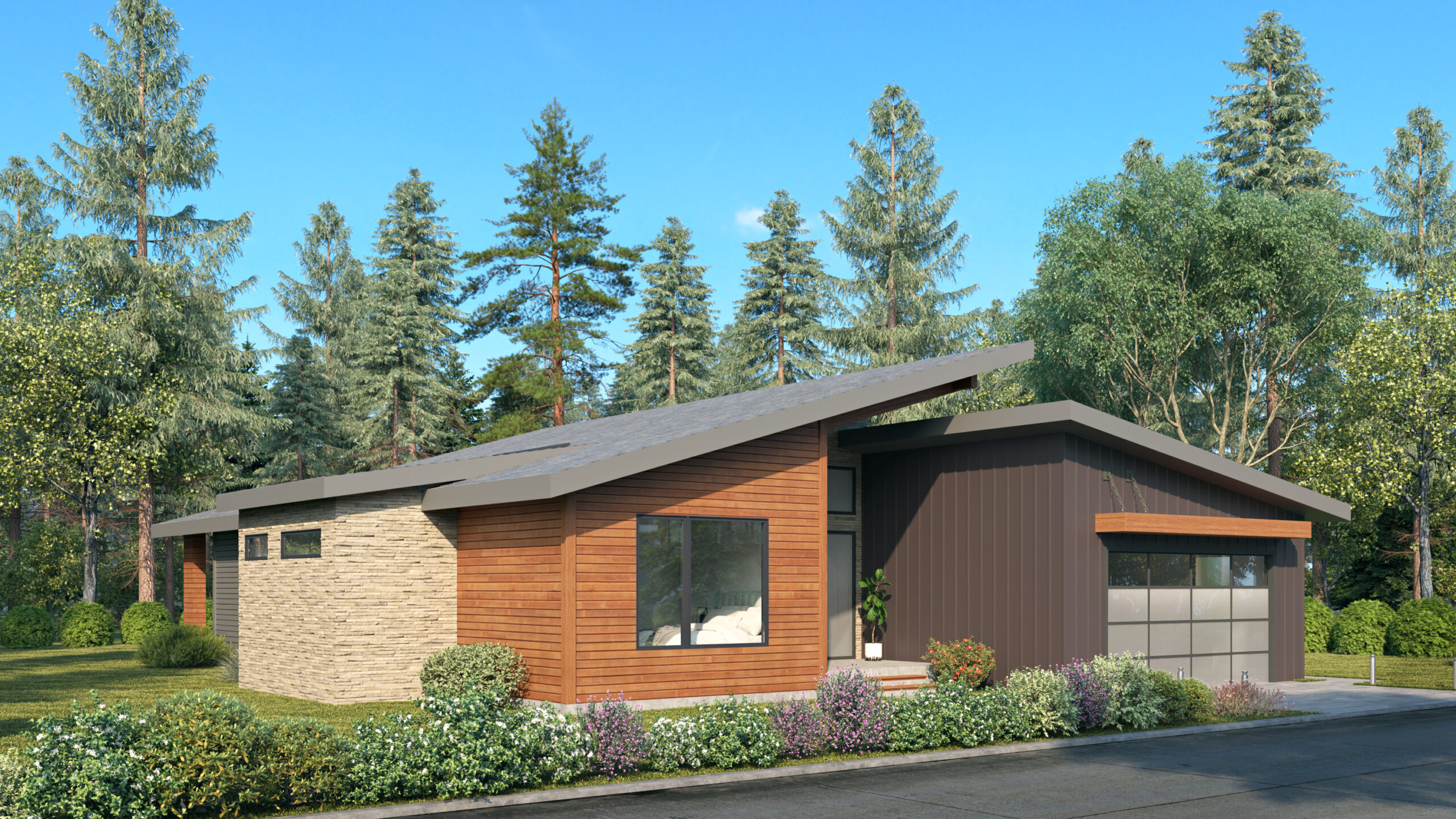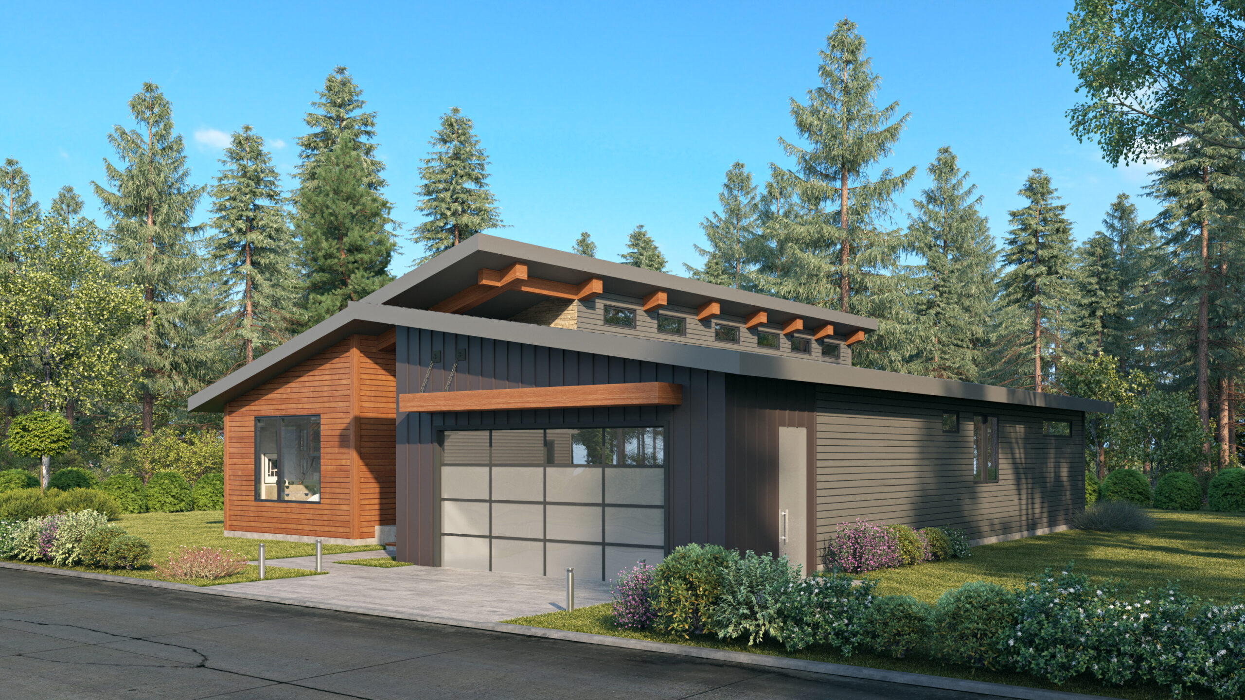 - Vertical and horizontal siding adorn the exterior of this Mid Century Modern home plan, complete with a flat rain awning above the double garage.