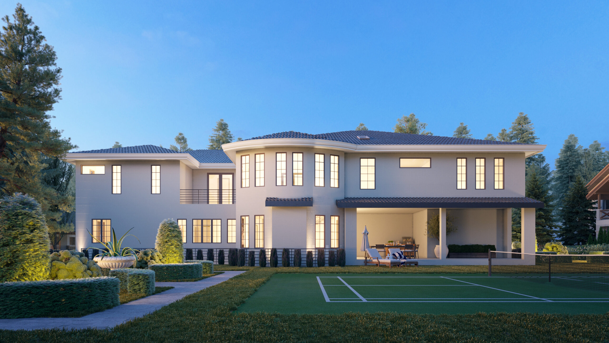 • The grand staircase is located in the center of the design, and guides you upstairs where 5 bedroom suites and the master bedroom are located, along with two laundry rooms and a playroom.
