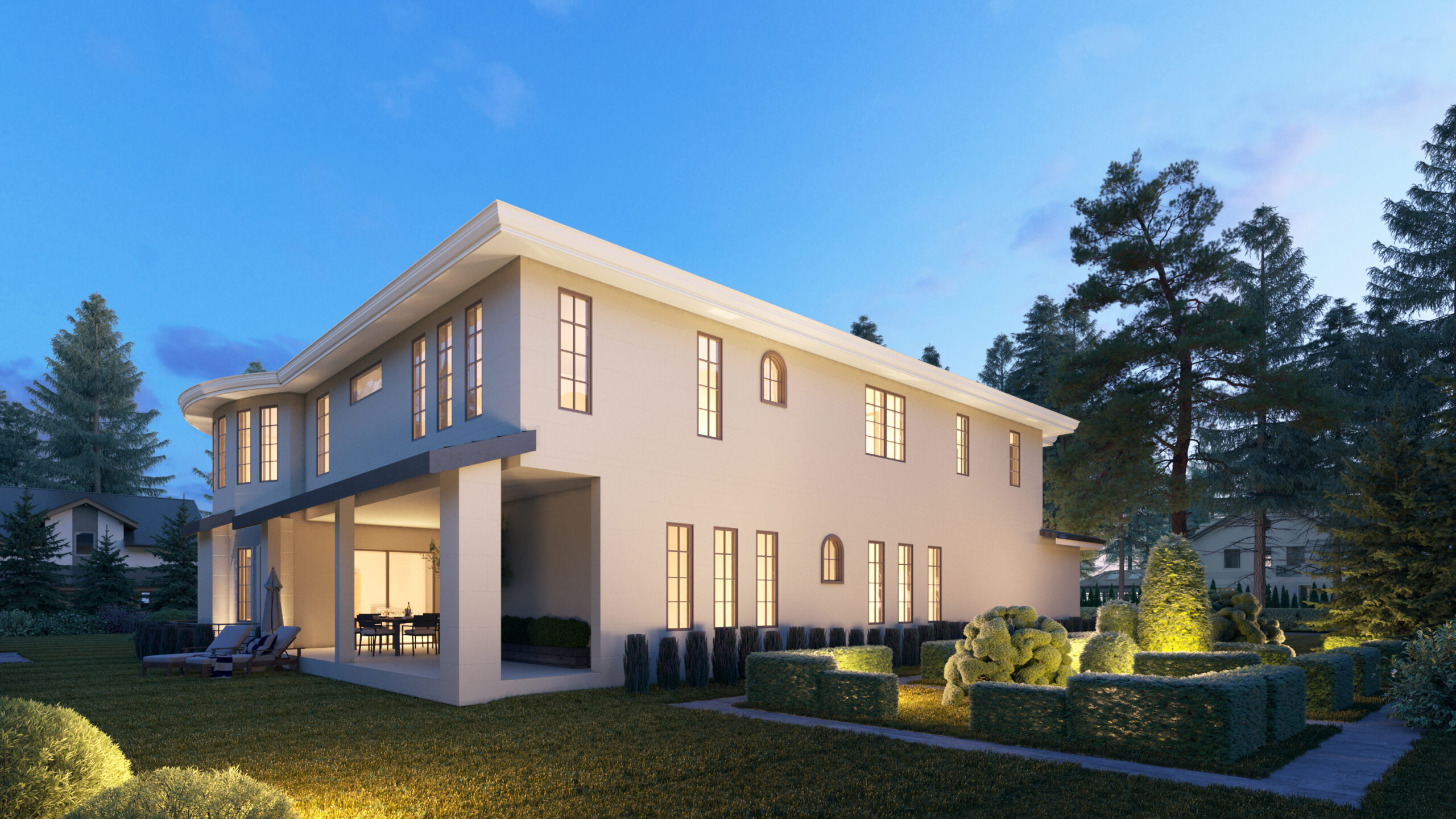 • A double garage protrudes from either side of the home. Inside, you will find multiple spaces to gather with elegant ceilings overhead. The main level is also home to a home office and two bedroom suites.