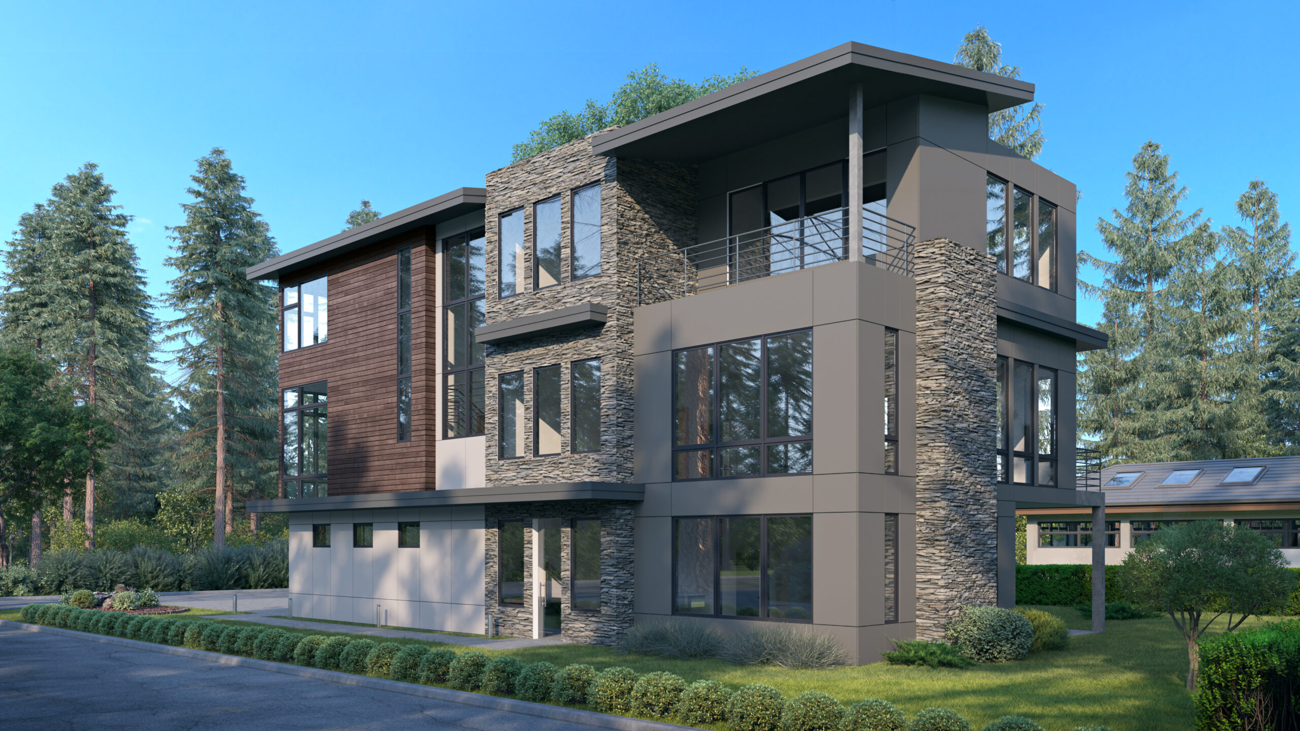 - This 3-story Modern house plan is perfect for narrow lots and presents a ground level with a double garage, 2 bedrooms, and a flex room that opens to a covered patio.