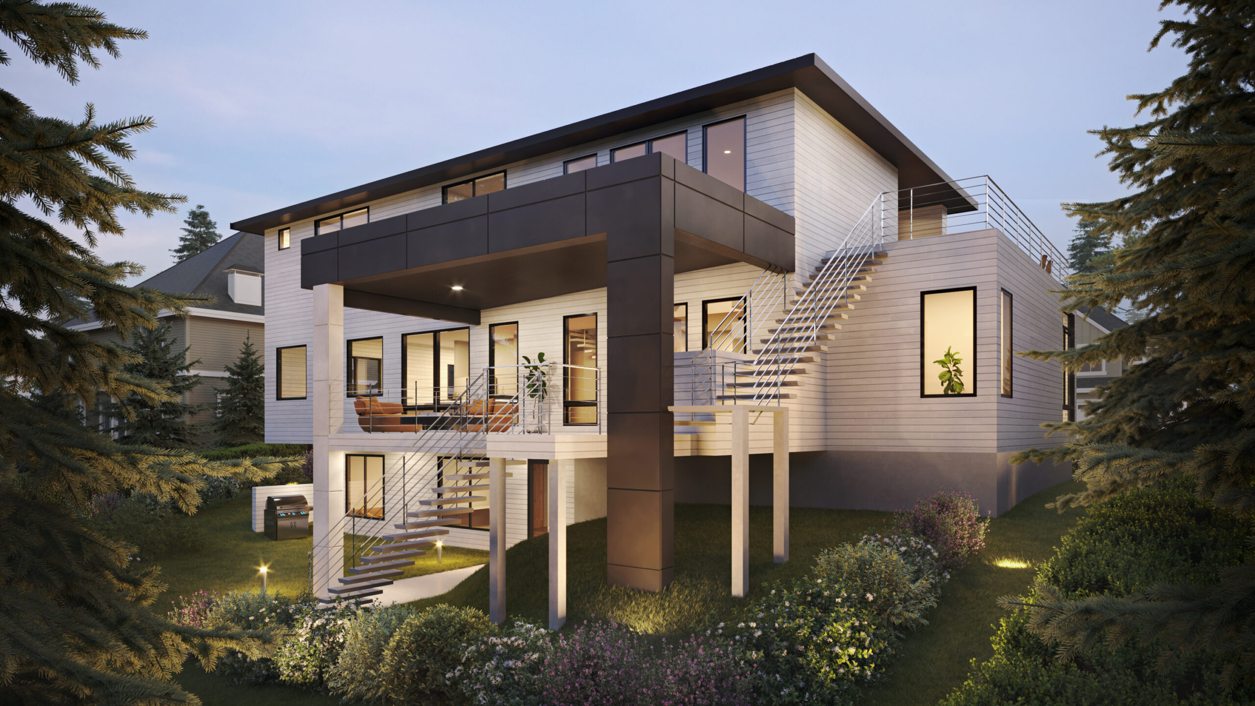 - This modern contemporary home plan gives you 5 bedrooms spread across 3 levels of living. Build it on a lot that slopes to the rear and enjoy outdoor access from the lower level rec room.