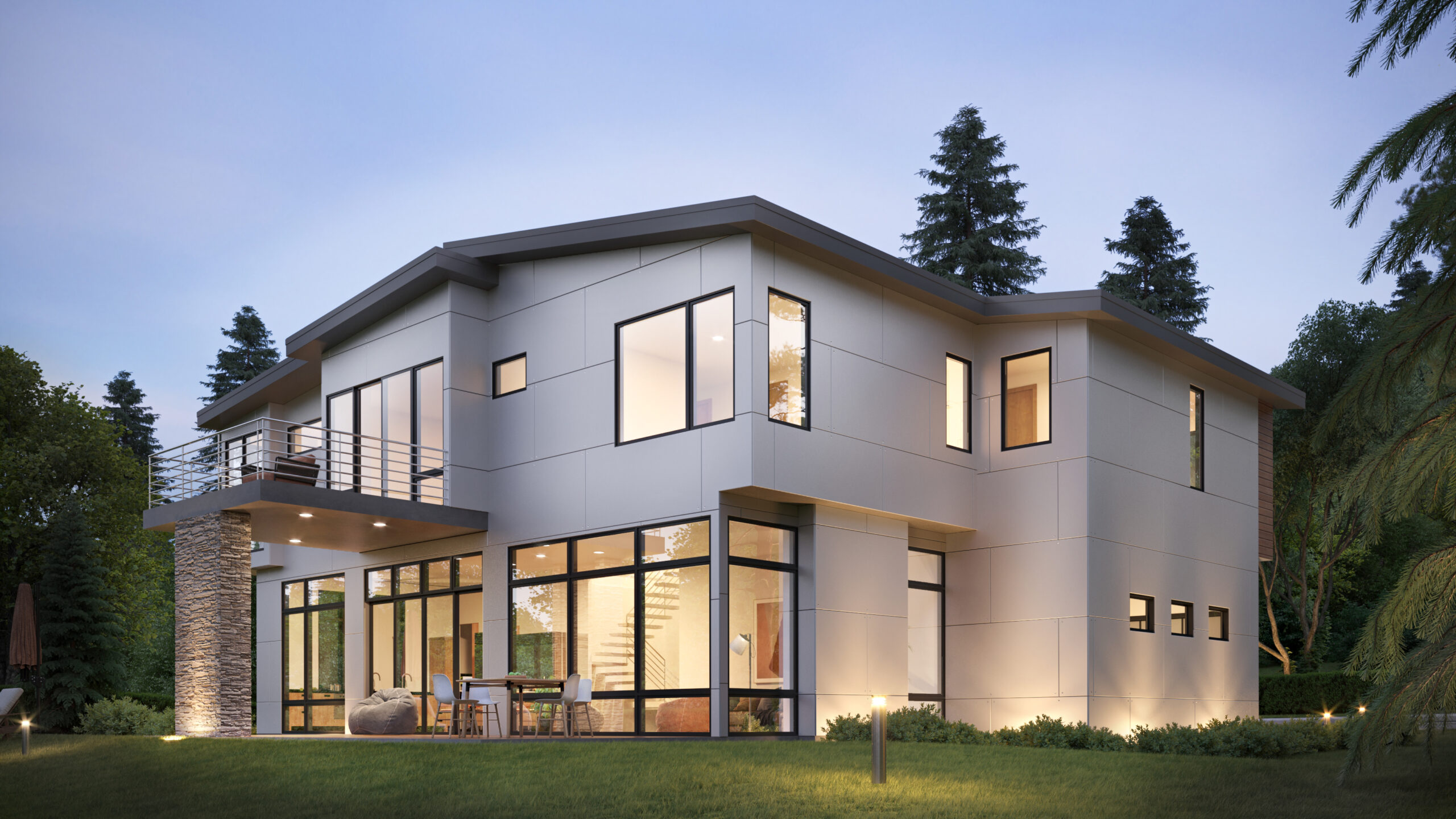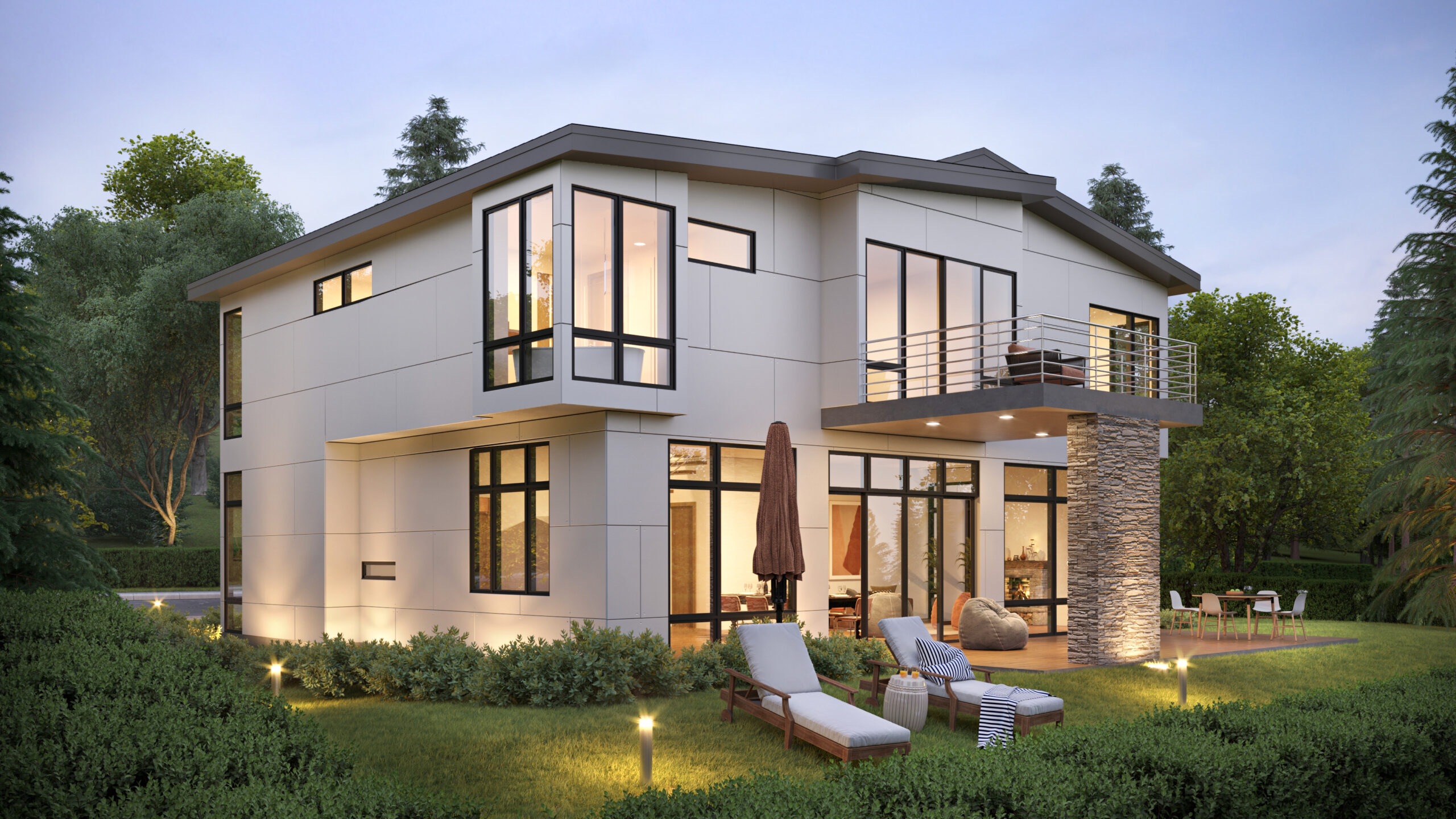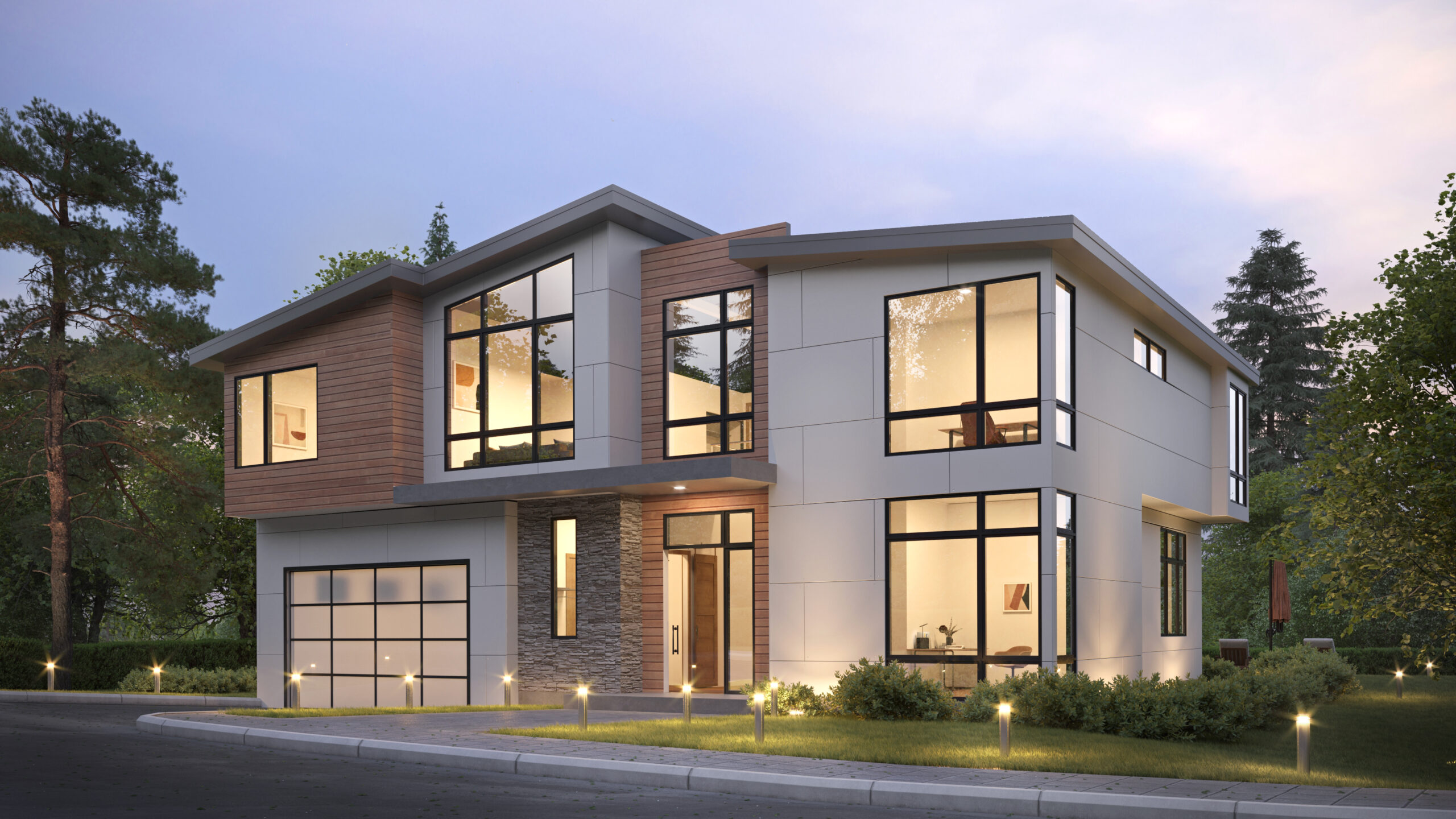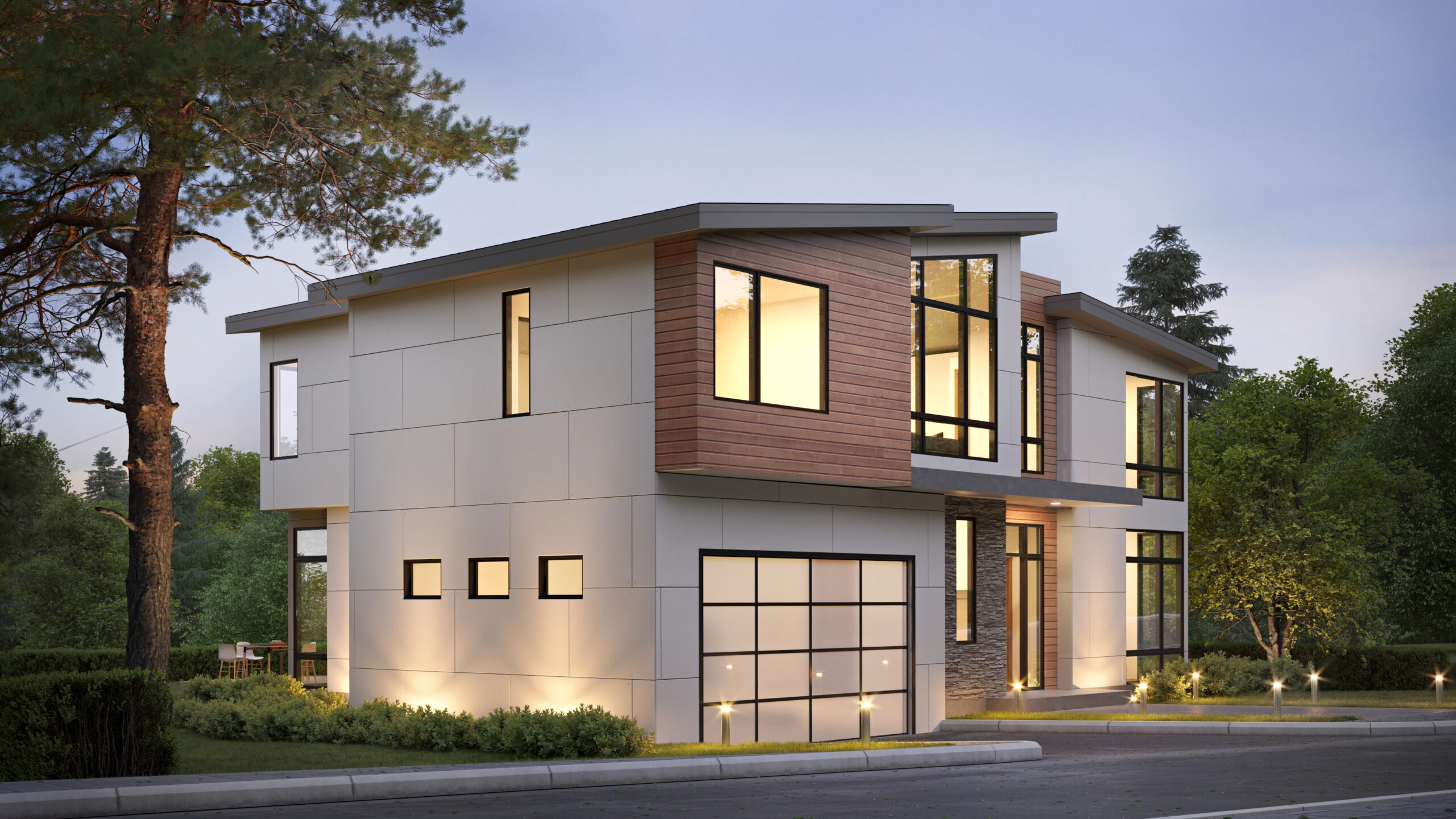 • Large windows on the front elevation of this Modern Northwest home plan ensure a light and airy interior.