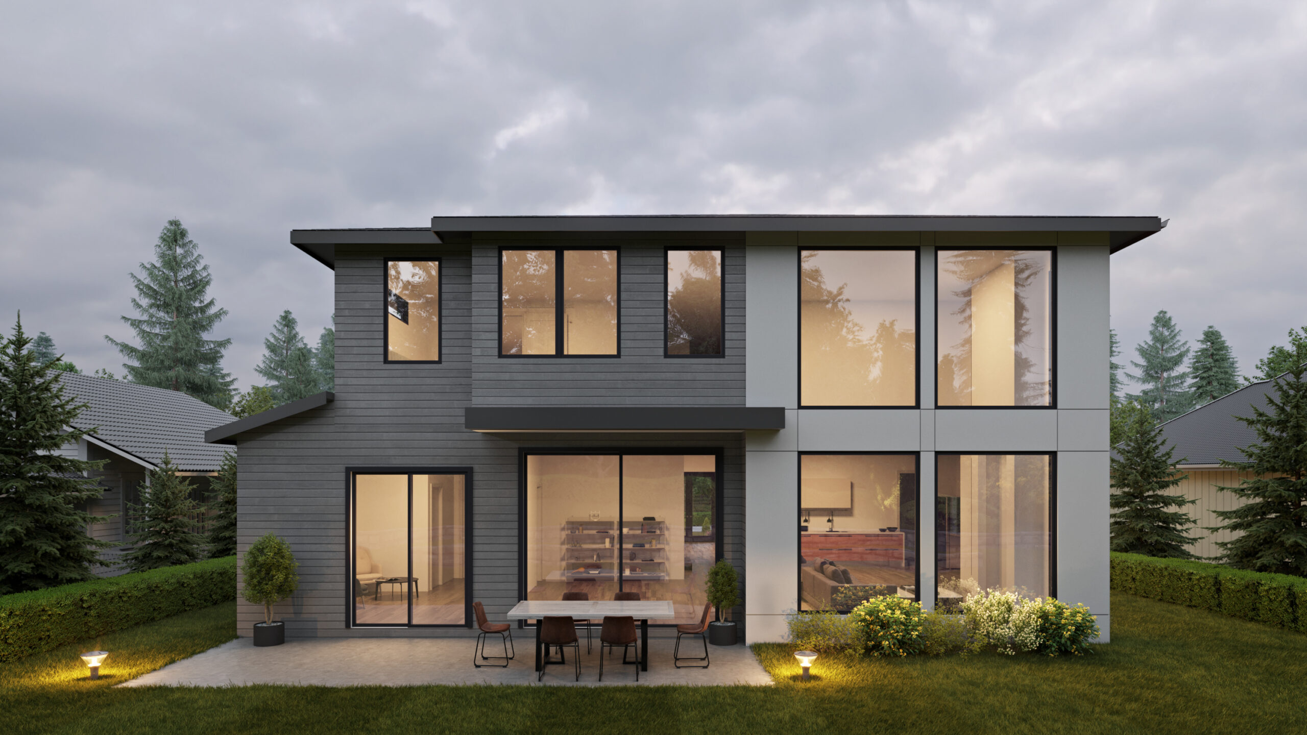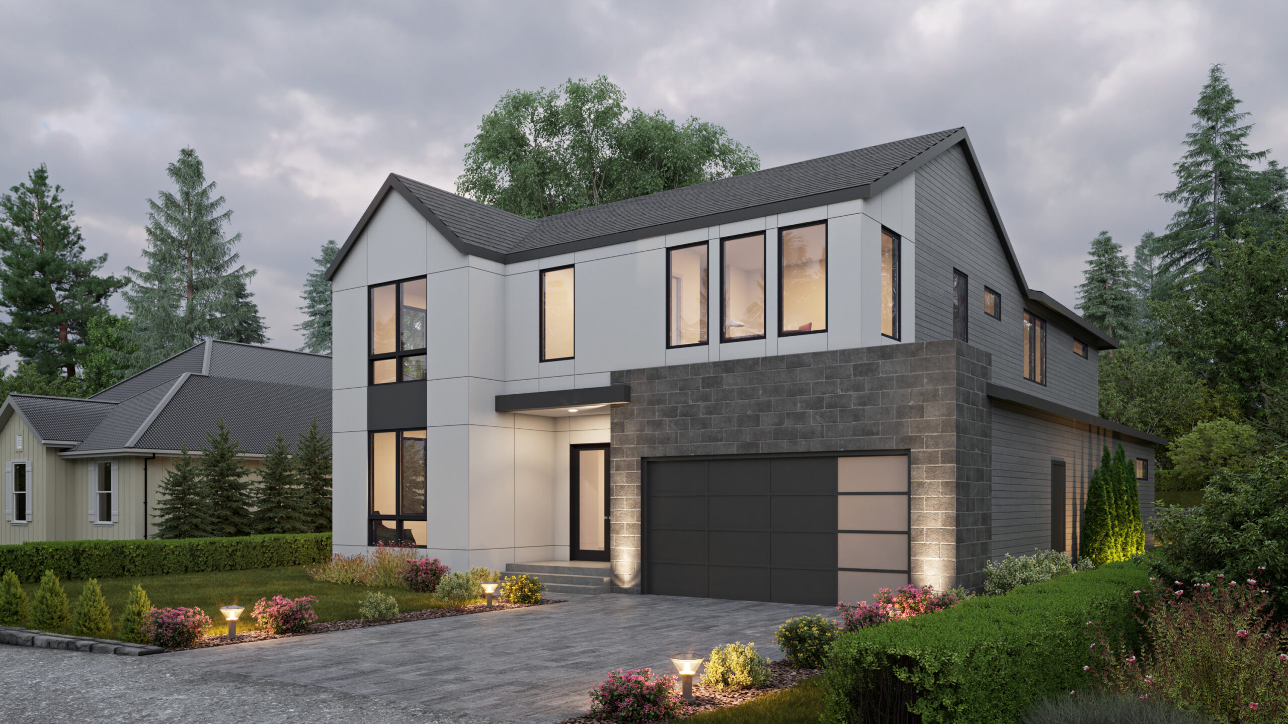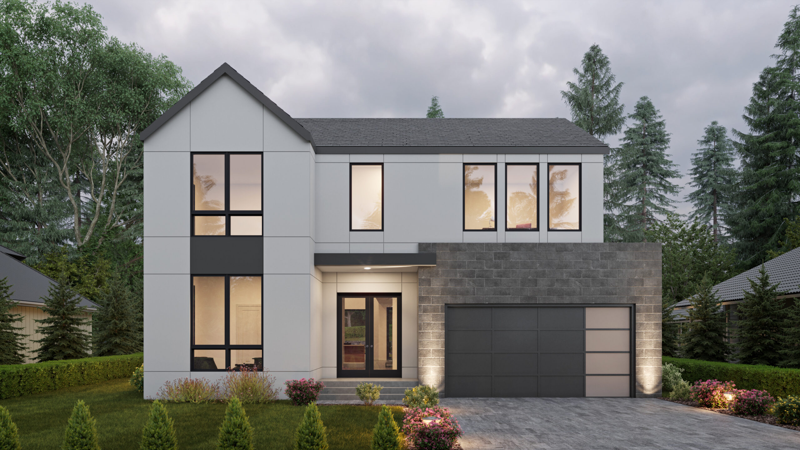 • The low-maintenance exterior of this Transitional, two-story house plan consists of oversized, concrete panels, large windows, and a forward-facing garage.