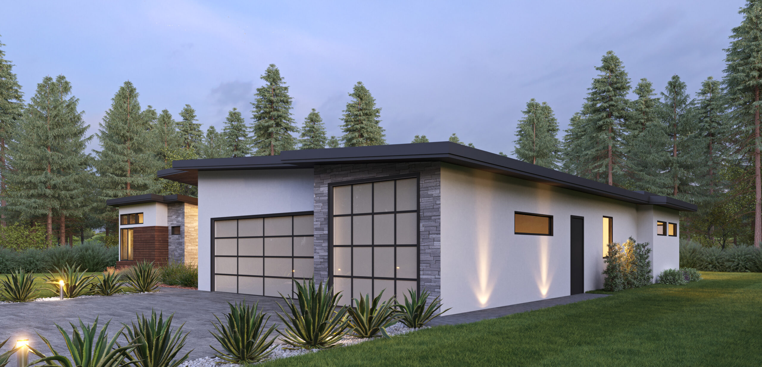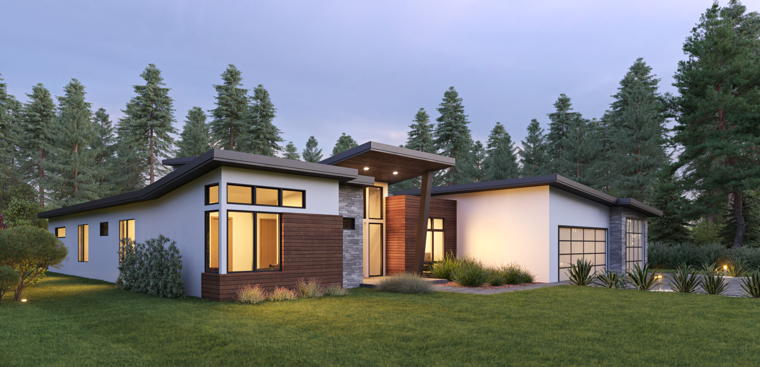 - This one-story modern house plan has a sleek exterior with a front-facing 3-car garage and a front door – protected from above – surrounded by glass.
