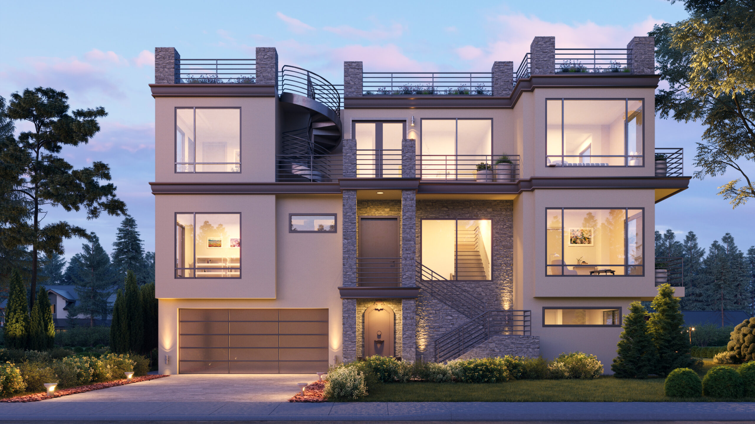 • The master bedroom on the third floor is drenched in natural light, and boasts a private balcony, luxury en suite with 5 fixtures, and a large closet. Two additional bedrooms, a bonus room, and the laundry room complete the third floor, and the forward-facing balcony includes a spiral staircase to the rooftop deck.