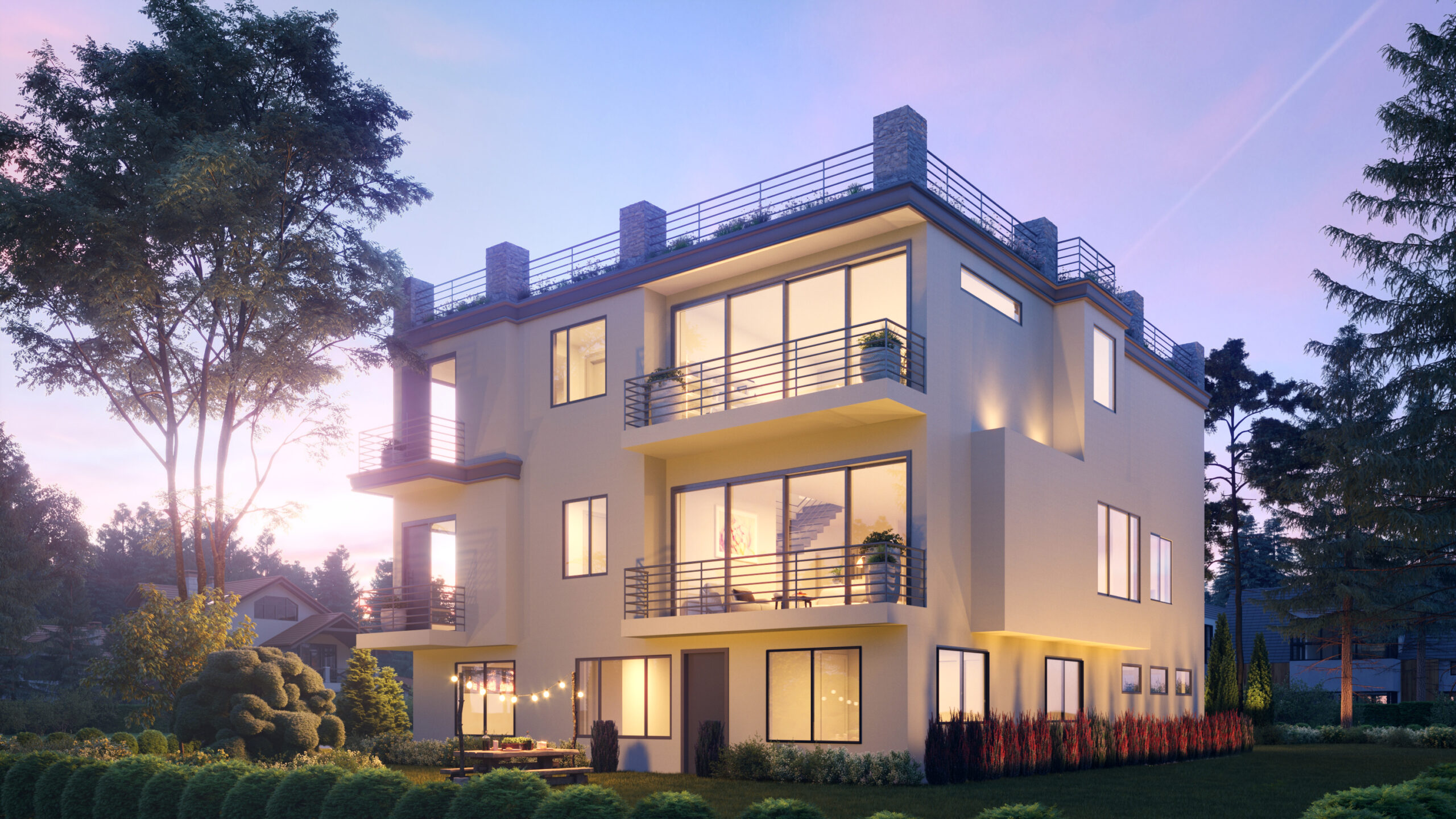 • Oversized windows, stucco, and stone accents make up the majority of this 3-story, contemporary home plan’s exterior. The expansive deck consumes the entirety of the rooftop, and allows for entertaining on a grand scale.