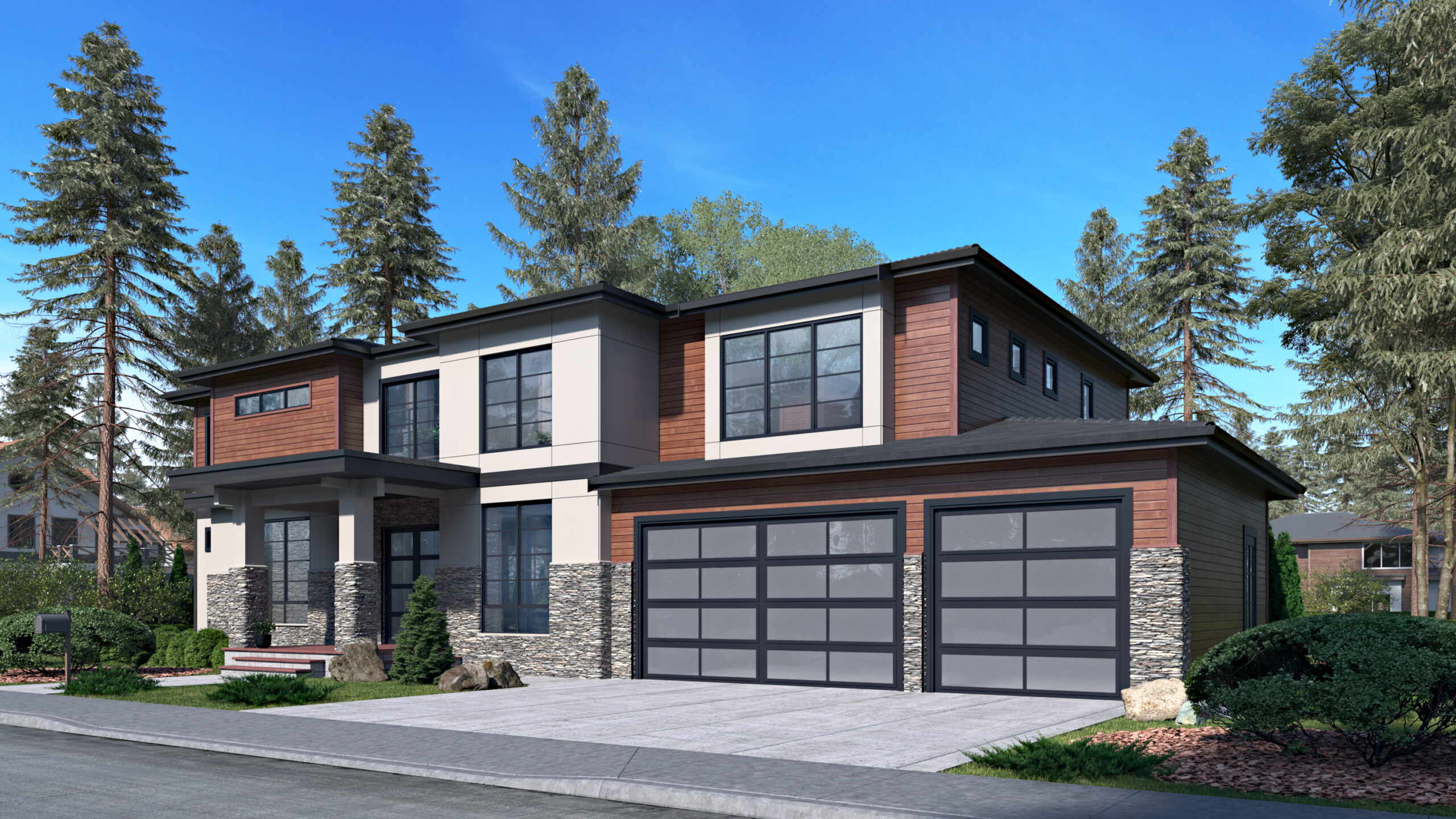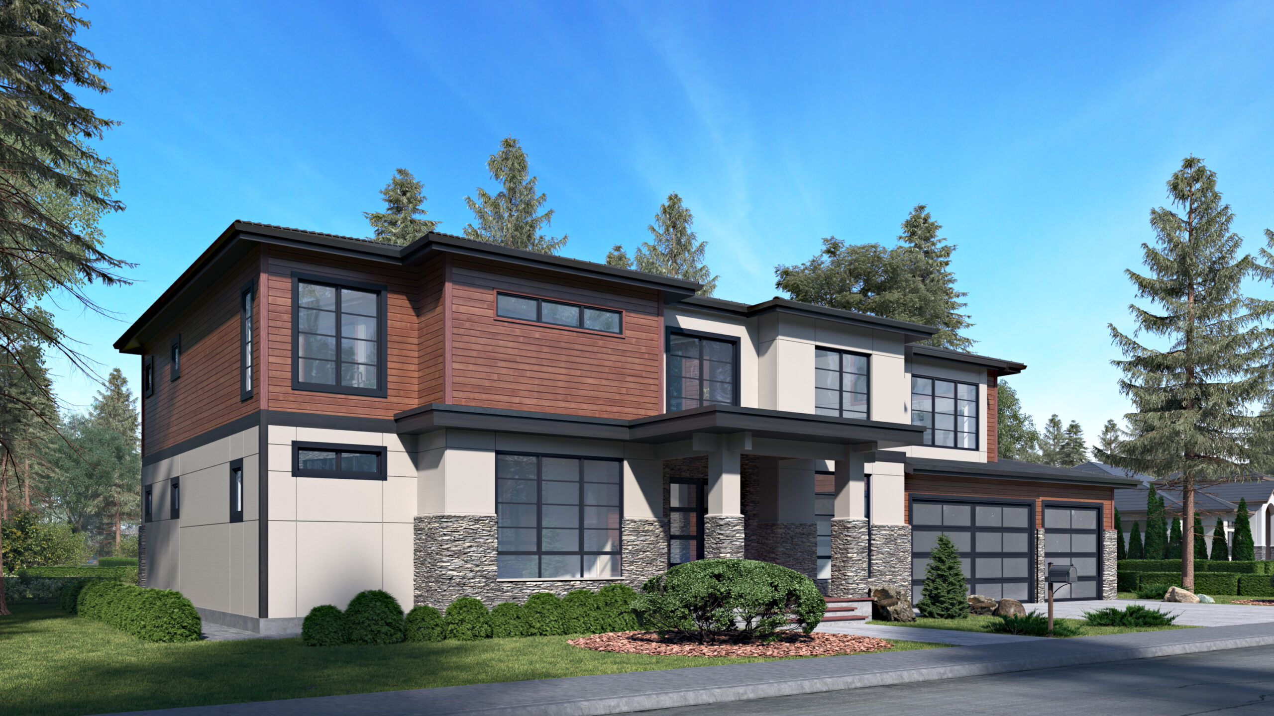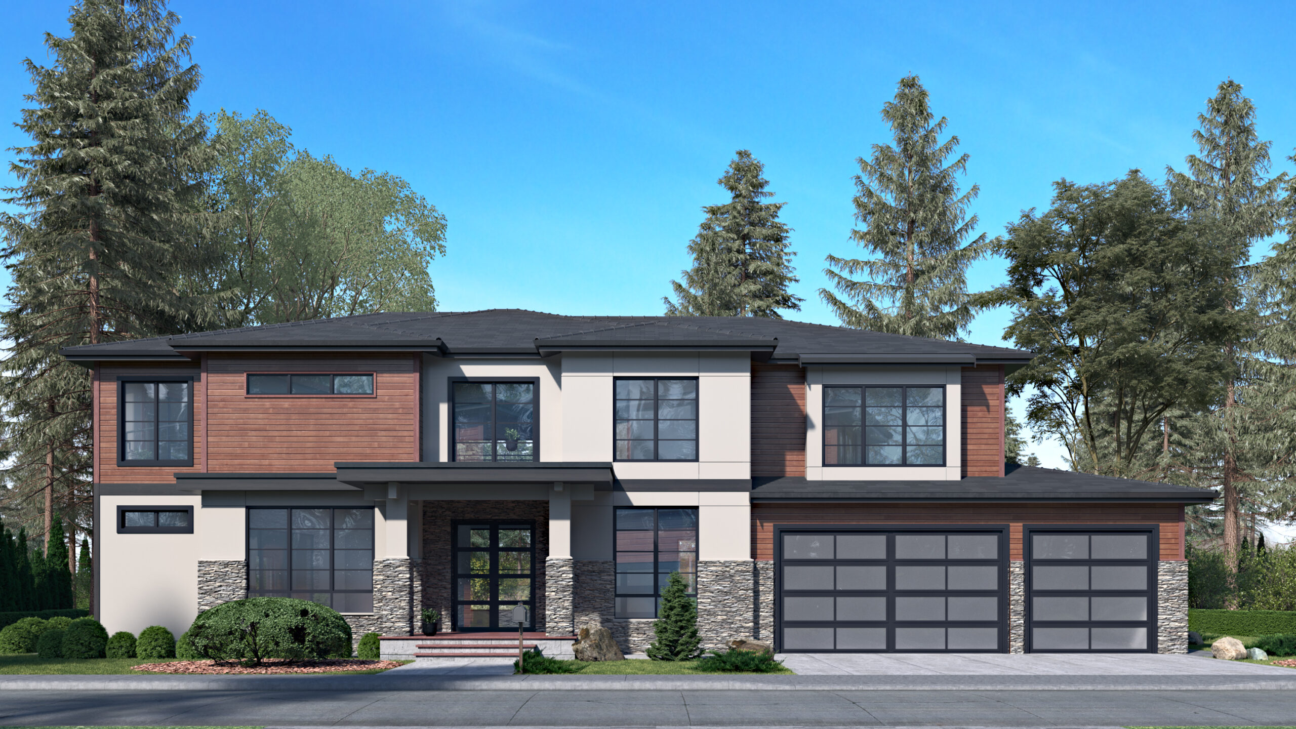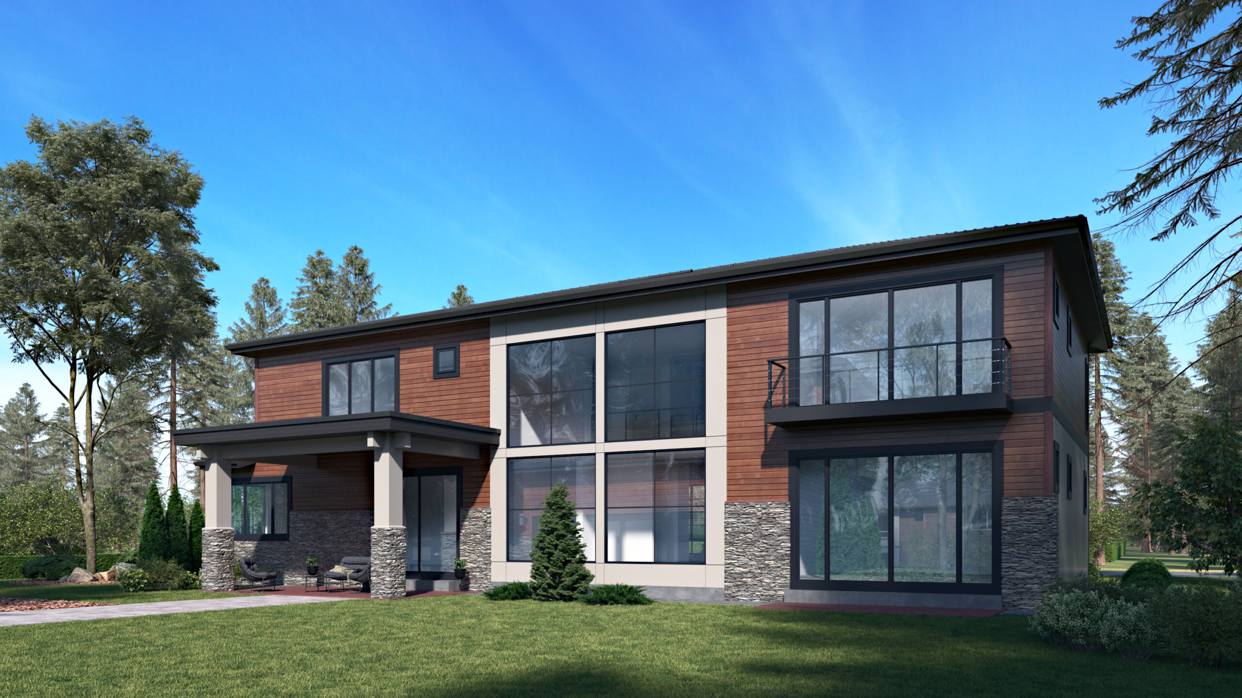- The aesthetically pleasing exterior of this contemporary, Northwest house plan boasts oversized windows, a low-pitched roof, and stone accents.