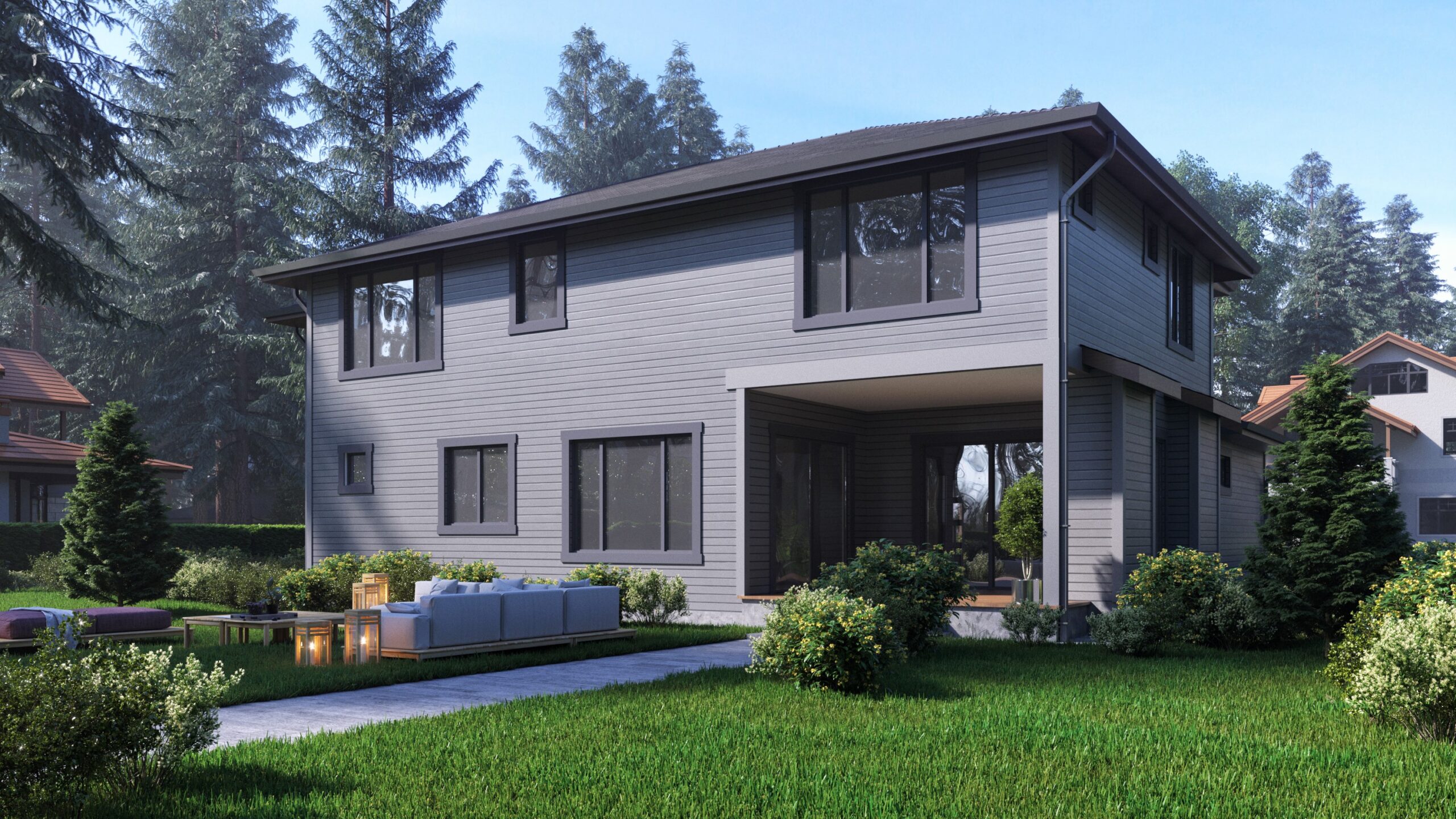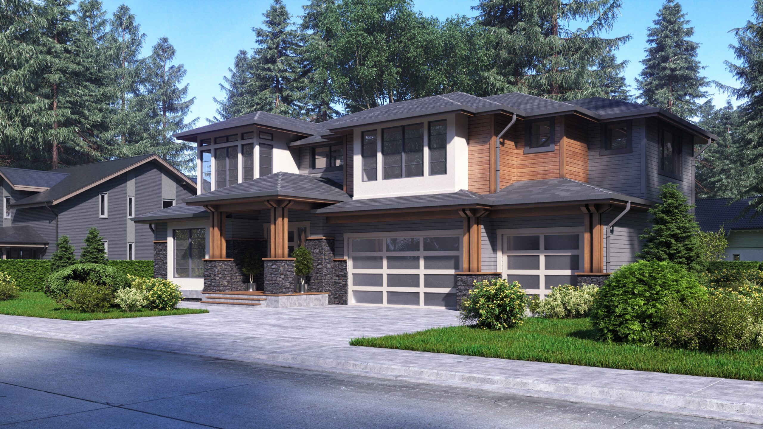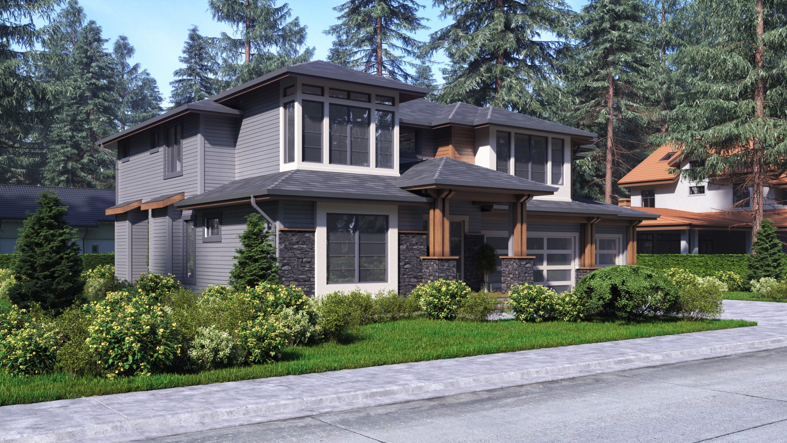 - This 4-bed modern Prairie-style house plan greets you with lots of windows – including transoms flanking the window-filled front door – and a covered entry supported by matching wood supports set on stone bases.