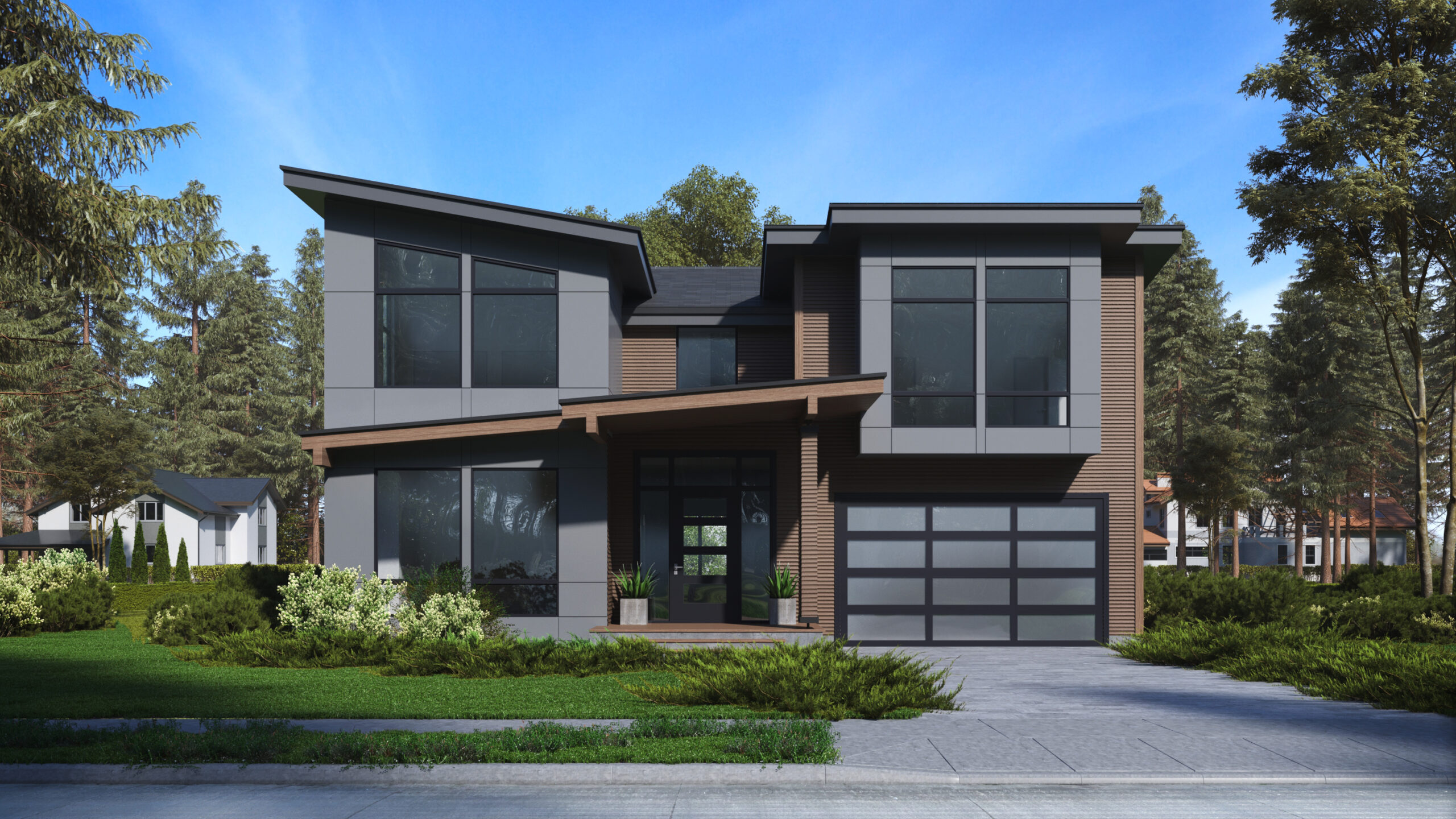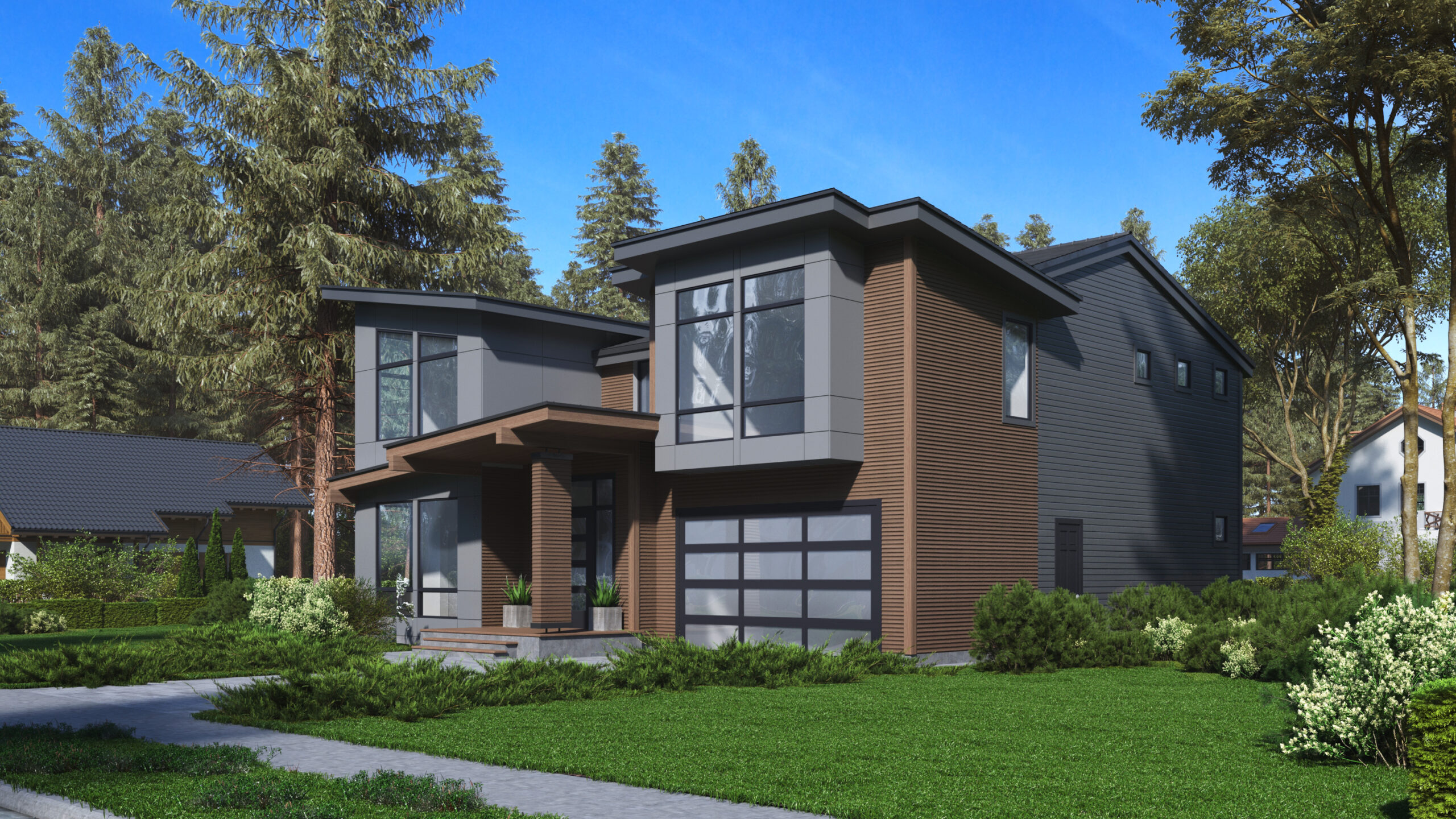- Slanted roof lines make the front elevation of this contemporary house plan stand out amongst the others, while large picture windows flood the interior with natural light.