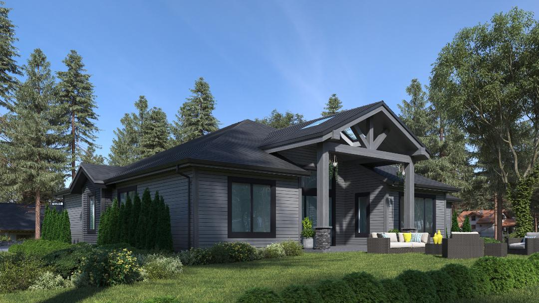• The rustic, timber-framed front porch serves as a focal point on the front elevation of this mountain, ranch plan, while the 3-car garage creates a parking courtyard by extending out of the front of the home.