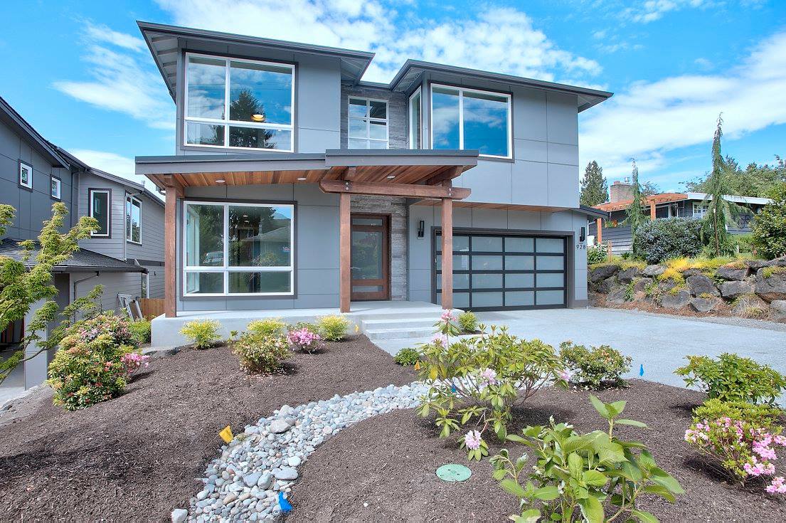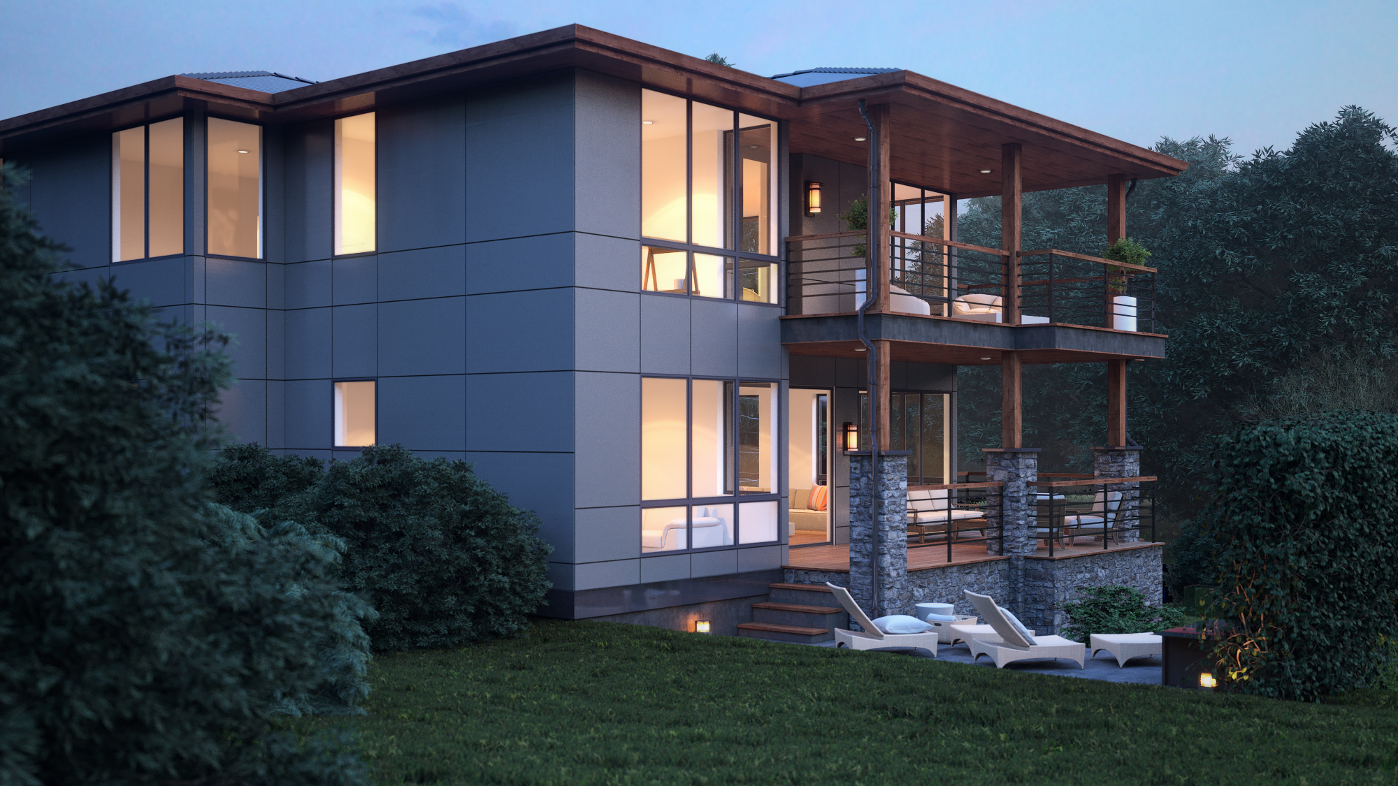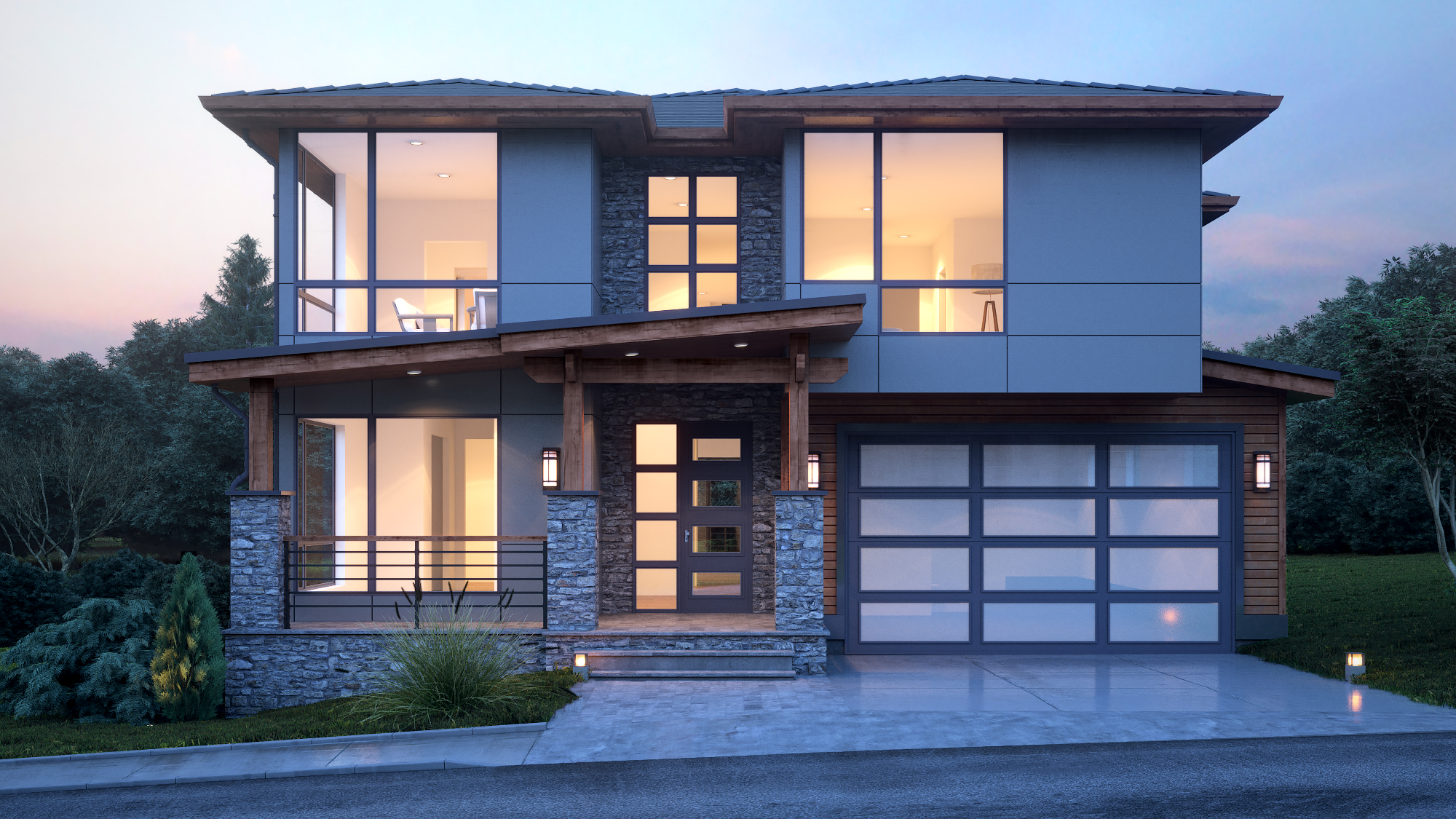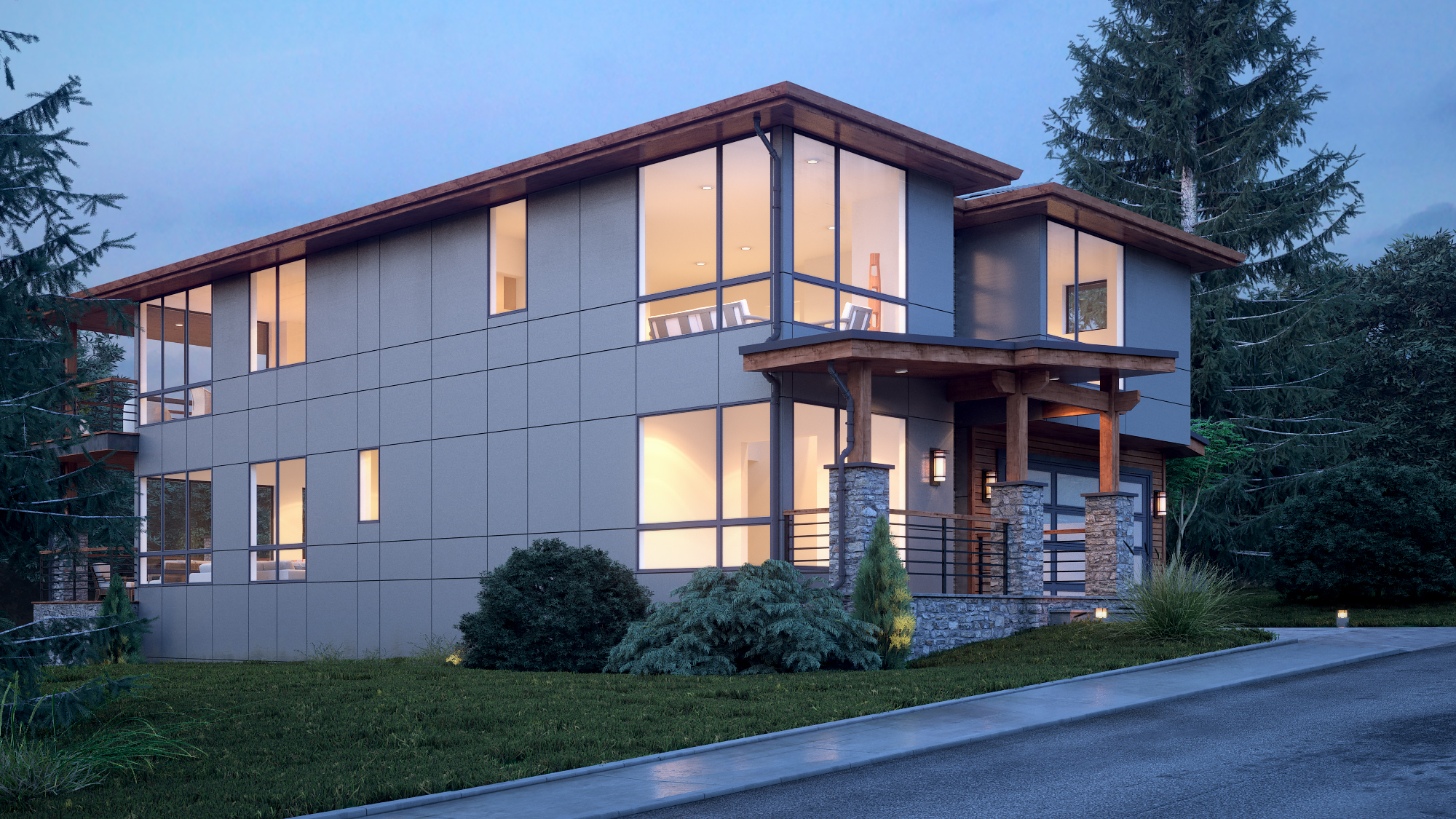 - Glass and oversized cement panels adorn the exterior of this modern house plan. The sloped front porch with a natural wood stain completes the design.