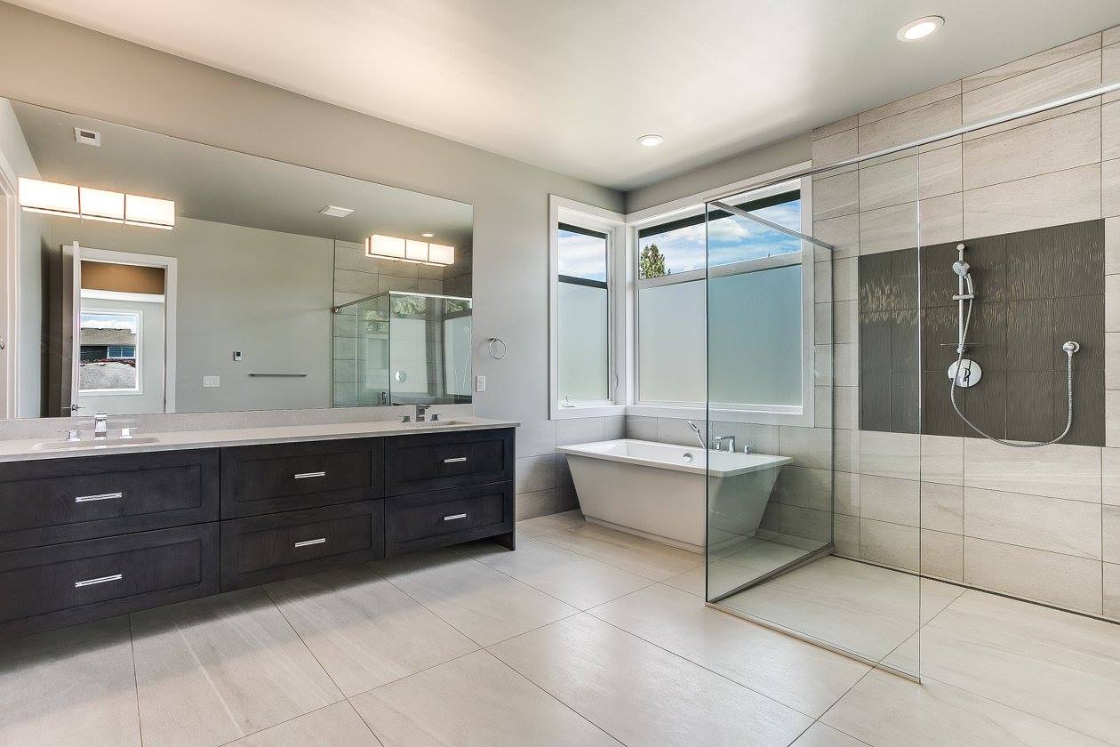 - The master suite rests towards the front of the home, and features pocket doors to a large walk-in closet and an ensuite with a soaking tub and private toilet room. A den, or third bedroom, also resides on this level.