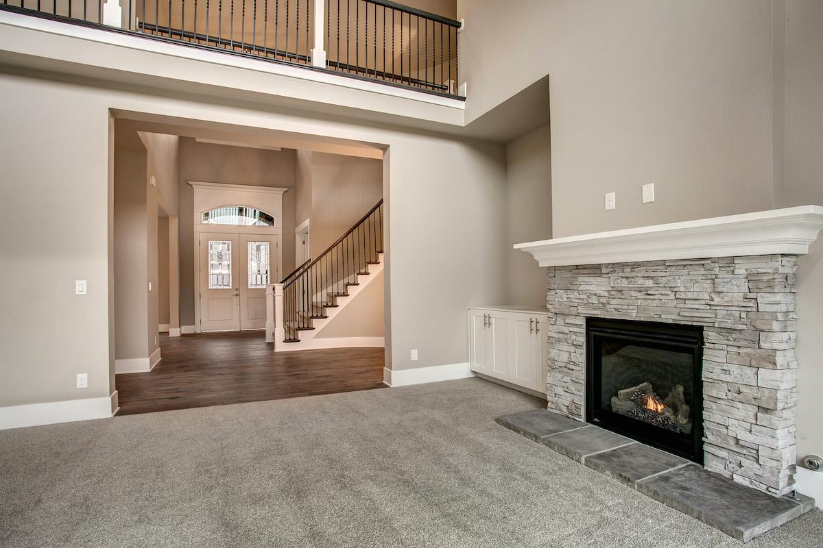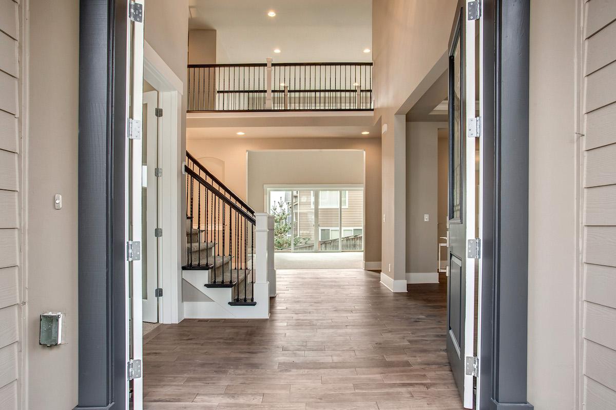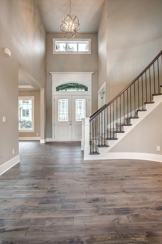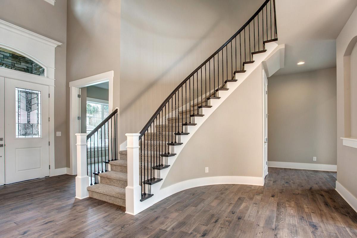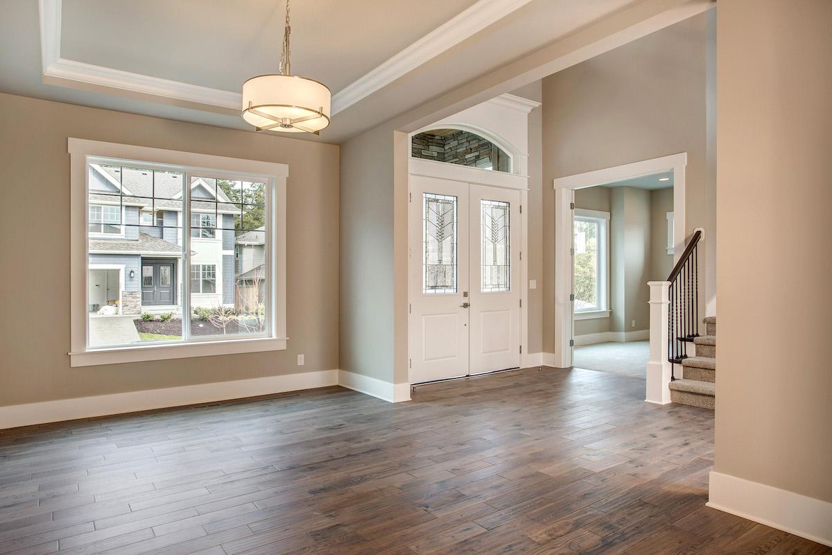 • A curved stairway is presented upon entering the light and airy foyer. To the left, a quiet den offers a place to retreat to for peace and solitude, while a formal dining room sits to the right.