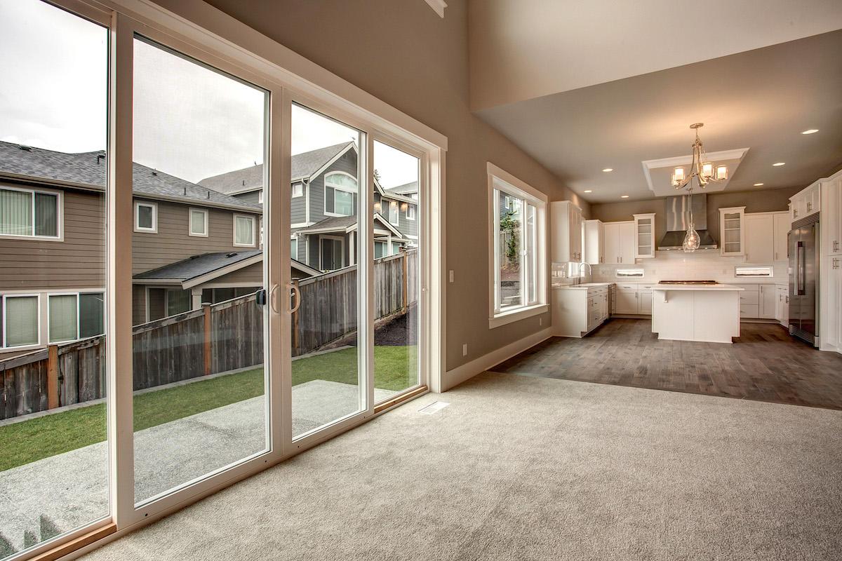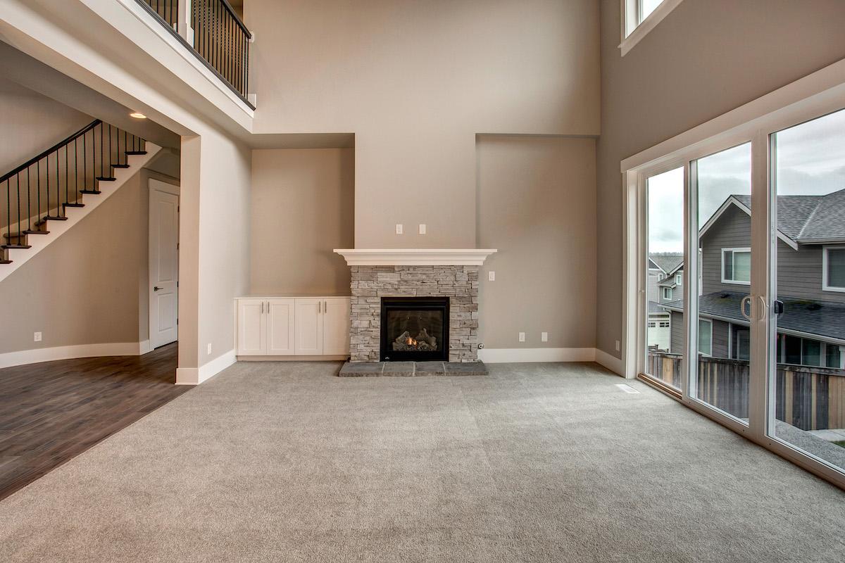 • Located towards the back of the home, the family room, breakfast nook, and kitchen are all open to one another, providing a comfortable flow. The u-shaped counters surround a large prep island offering ample workspace.