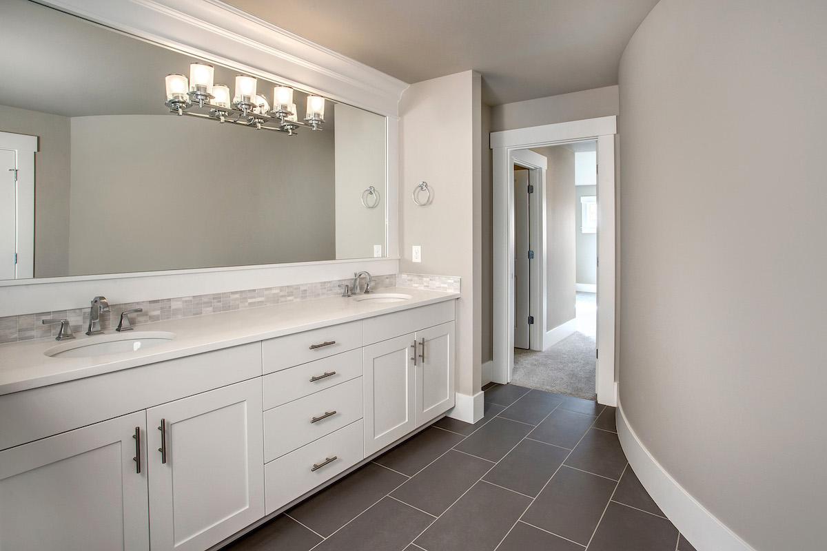 • Upstairs, the master suite rests on the left side, while a bridge-style hall connects to the secondary bedrooms. A vaulted ceiling in the master gives a feeling of spaciousness and a lavish en suite includes a soaking tub and commode room.