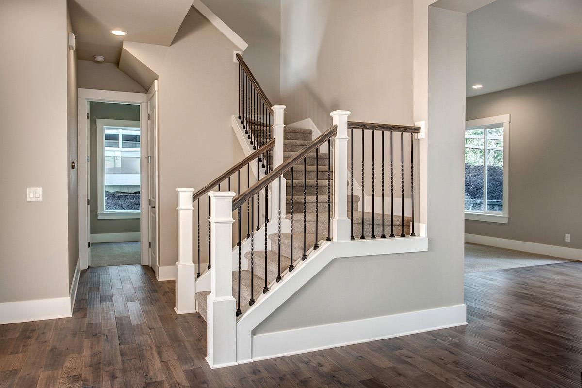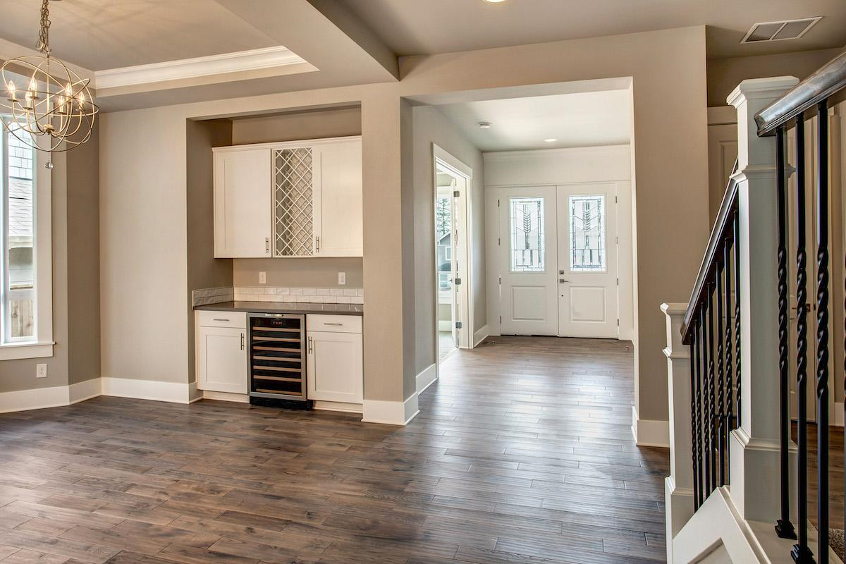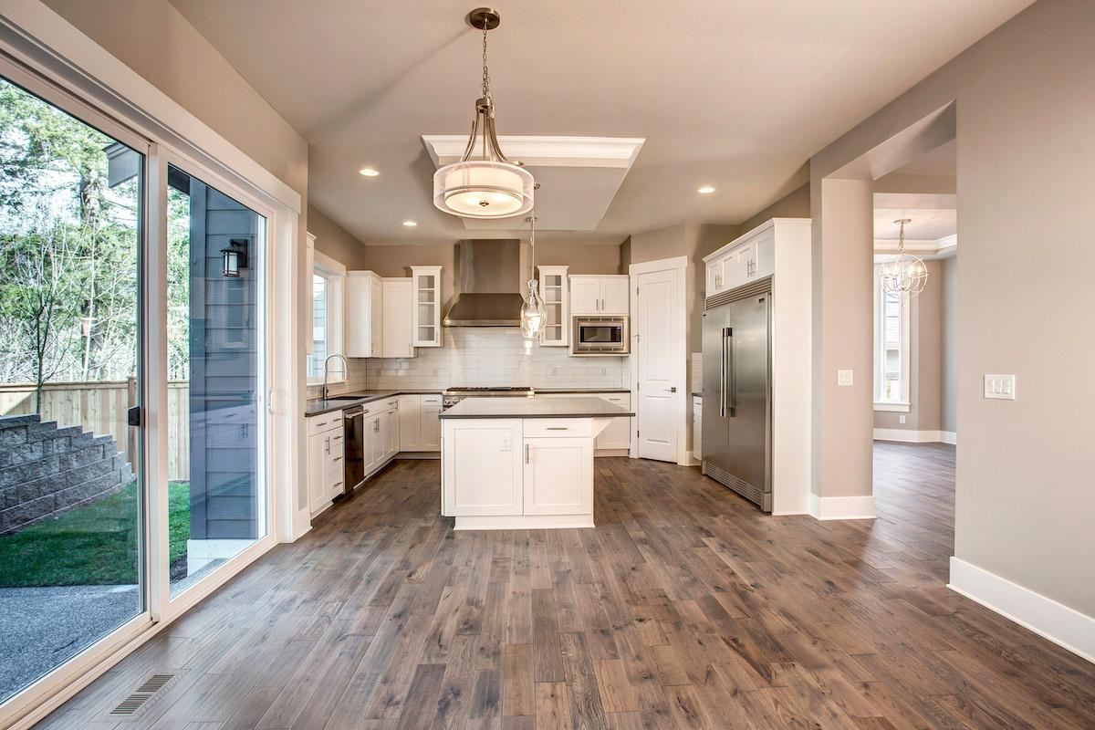 - Towards the back of the main level, the kitchen, breakfast nook, and family room create the center for everyday living. A large prep island is surrounded by counters and a corner pantry offers ample storage space.