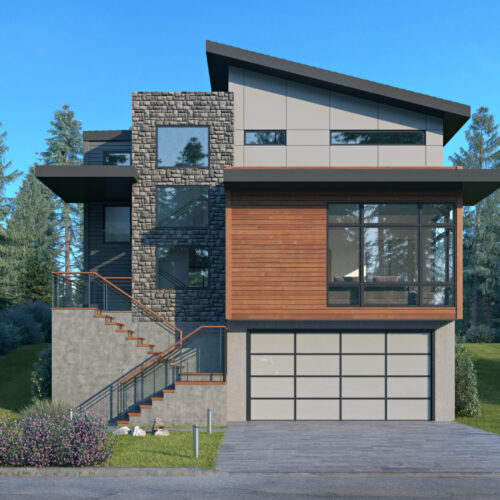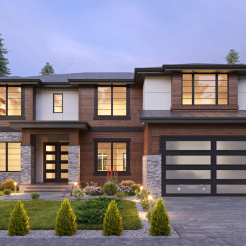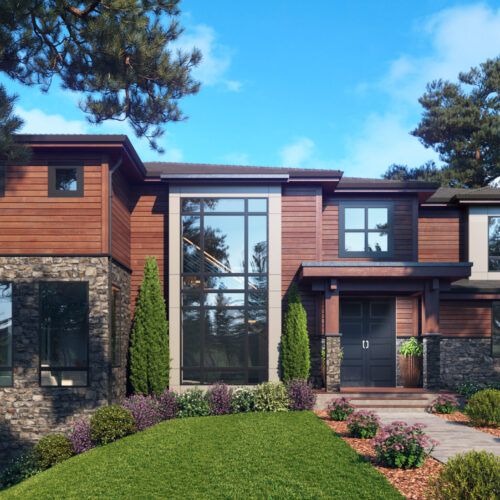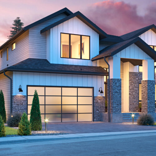 - The forward-facing, double garage rests near a front porch on the front elevation of this two-story, craftsman home plan, with board and batten siding beneath the gables.